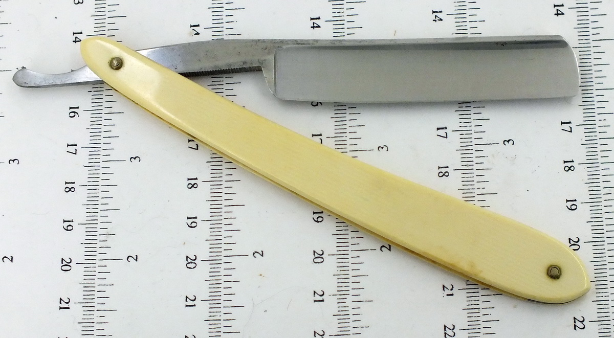 5/8', 1/2 холлоу. Углеродистая сталь, целюллоид "под слона" Практически не пользованная. Кромочка 0,3 мм., равномерная. Выглядит вполне бодро. Разбирать не стал. Слегка протер Флитцем. Следы времени остались, на фото выглядят преувеличено. Бритва заточена и готова к бритью. Продано на другом ресурсе. Spoiler Show