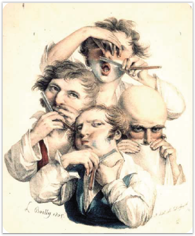 „We Do Our Part - NRA Barber Shop” „Мы делаем свое дело - парикмахерская NRA” 1934 г. И сново Louis Leopold Boilly (1761-1845) Луи Леопольд Буали. Гравюра с названием „Le jour de barbé” „Ден бороды” Встречается и в цветном виде С 2013 г. с кайфом бреюсь опасной бритвой пять раз в неделю, в три прохода.