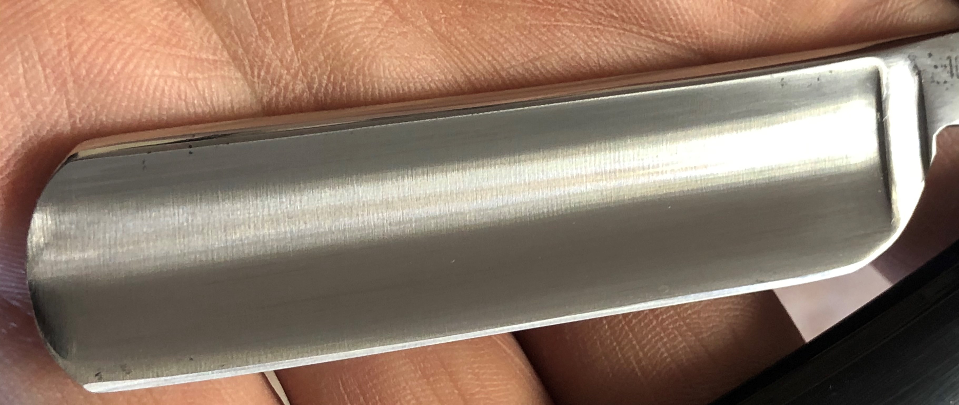 Бритва находится в состоянии приближённому к идеальному.Без следов пользования.Разобрал, немного освежил полотно на самых тонких абразивах и заново собрал. Очень красивая, эффектная оправа будет в самый раз такой бритве.Сталь чистая, без видимых дефектов.