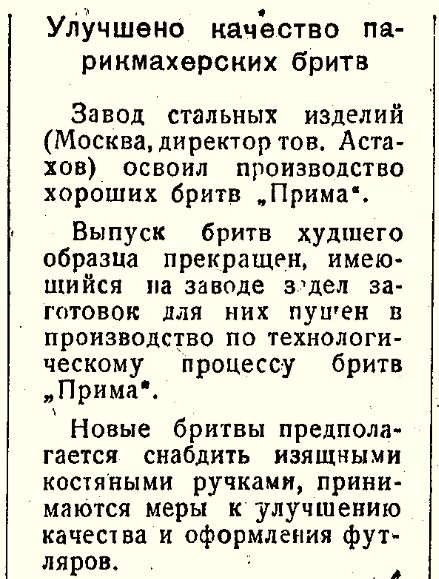 Завод Стальных Изделий (Москва, директор тов. Астахов) освоил производство хороших бритв "Прима". Имеющийся на заводе задел заготовок пущен в производство по технологическому процессу бритв "Прима".