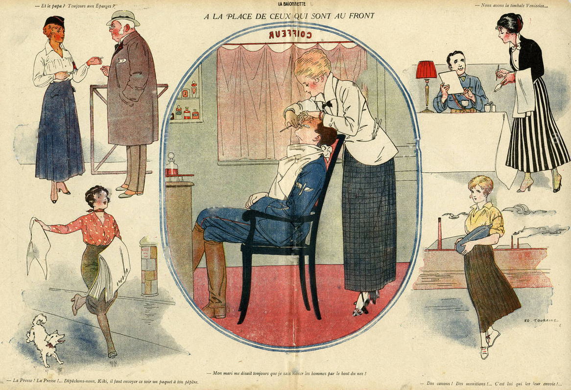 Художник прожил короткую жизнь (39 лет), но оставил яркий след... Карикатура «Замена тех, кто на фронте», показывающая, как француженки брали мужскую работу во время Первой мировой войны: бреют мужчину в парикмахерской, штампуют проездной, продают газеты, служат в кафе и работают на заводе по производству боеприпасов. Картина была изуродована сервисом alamy (торгуют изображениями), вычистил как мог (даже не знал что так можно было - есть специальные проги). Инфу собирал по крохам. На картине стоит подпись художника (не совсем разборчиво) - с 10-й попытки удалось расшифровать. Змей Болгариныч, опять было?