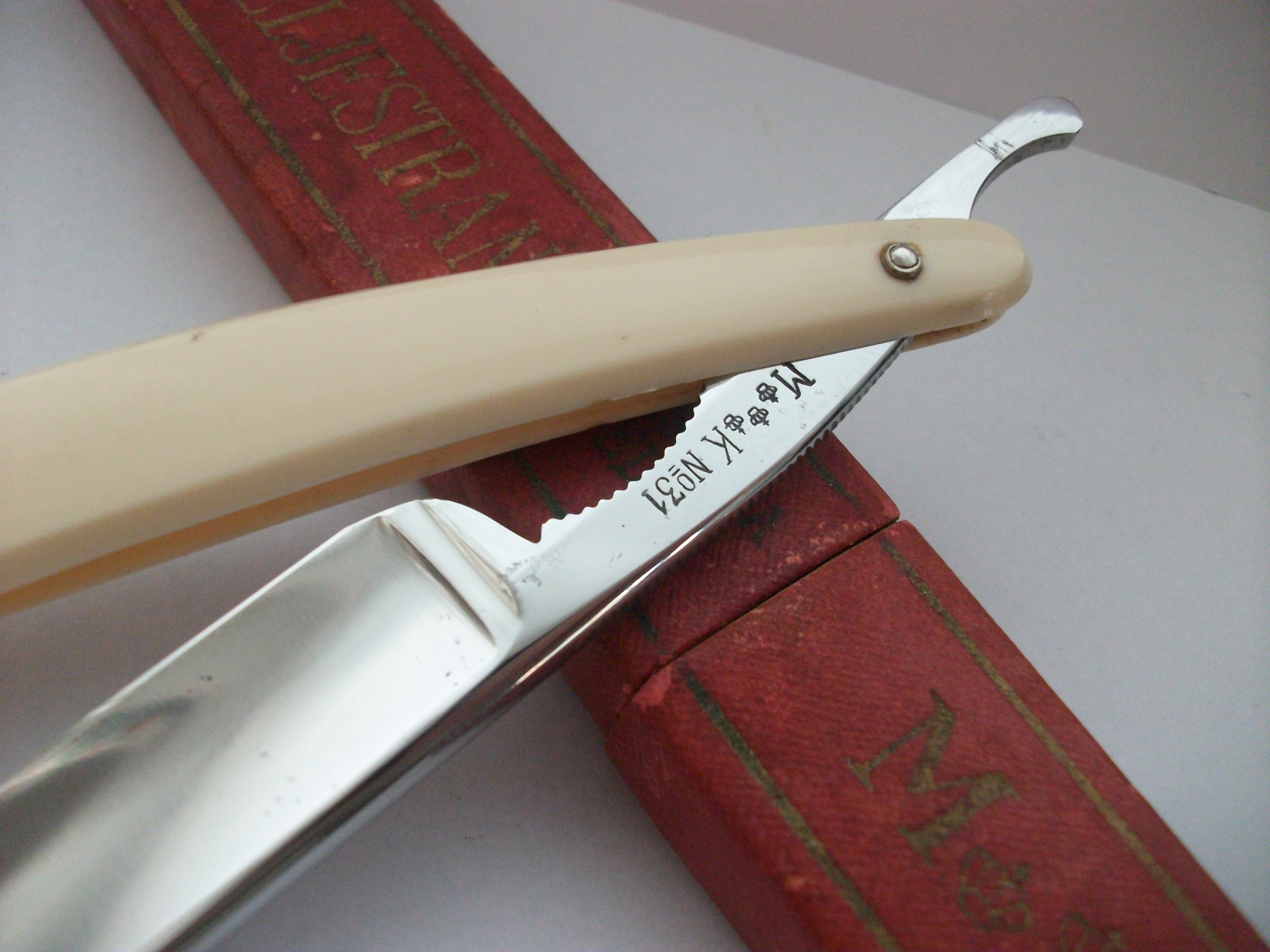 Углеродистая сталь, ширина полотна 15мм, длина режущей кромки примерно 70мм. Полотно в хорошем состоянии - родной сатин и травление. Сталь в работе очень понравилась. Ручка пластик. Заточена и готова к бритью. Продано Spoiler Show