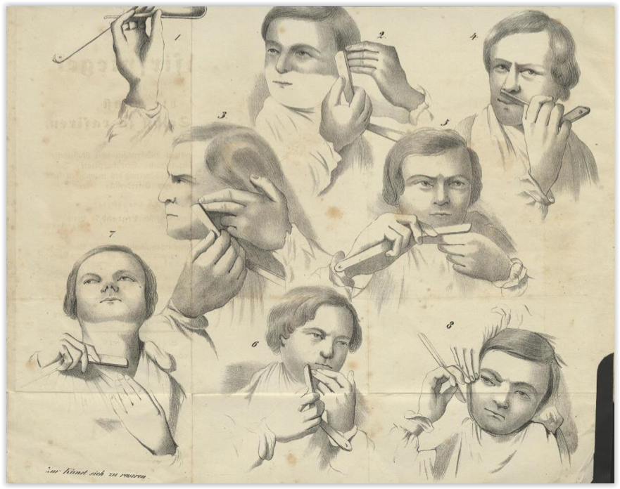 Опасная бритва в искусстве (картины, рисунки, фото, тату)Иллюстрация из книги „Зеркало для бритья или искусство бритья, а также необходимые инструкции по бритвенным ножам, английской минеральной пасте, щеткам, мылу и всему необходимому, чтобы украсить мужское лицо. Понятно представленные профессором Леграном в Париже.”, Веймар 1846 г.