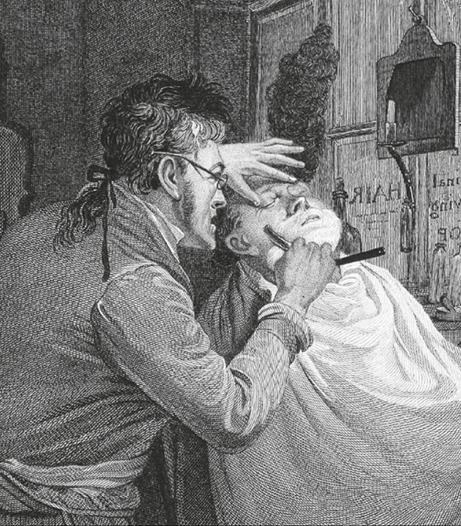 По его рисунка гравюру сделал Henry Hoppner Meyer (1783-1847). Генри Хоппнер Мейер был английским художником-портретистом, более известным как гравером. „A barber shaving a man with a blunt razor” 1829 г. „Парикмахер бреет человека тупой бритвой” С 2013 г. с кайфом бреюсь опасной бритвой пять раз в неделю, в три прохода.