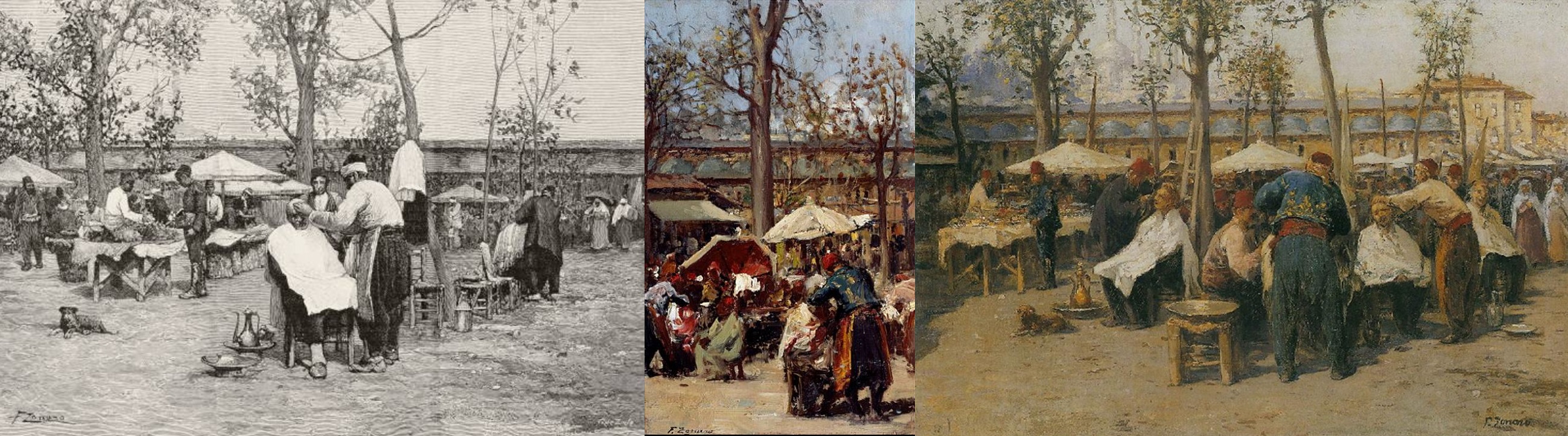 „Barbers' outdoor salon, Constantinople”, 1891-1910 гг. „Парикмахерская на открытом воздухе, Константинополь” И сново Fausto Zonaro, Фаусто Зонаро „Open-air barbers, Istanbul, Turkey”, опубликована в „L'Illustrazione Italiana”, 1895 г. „Парикмахерские под открытым небом, Стамбул, Турция”