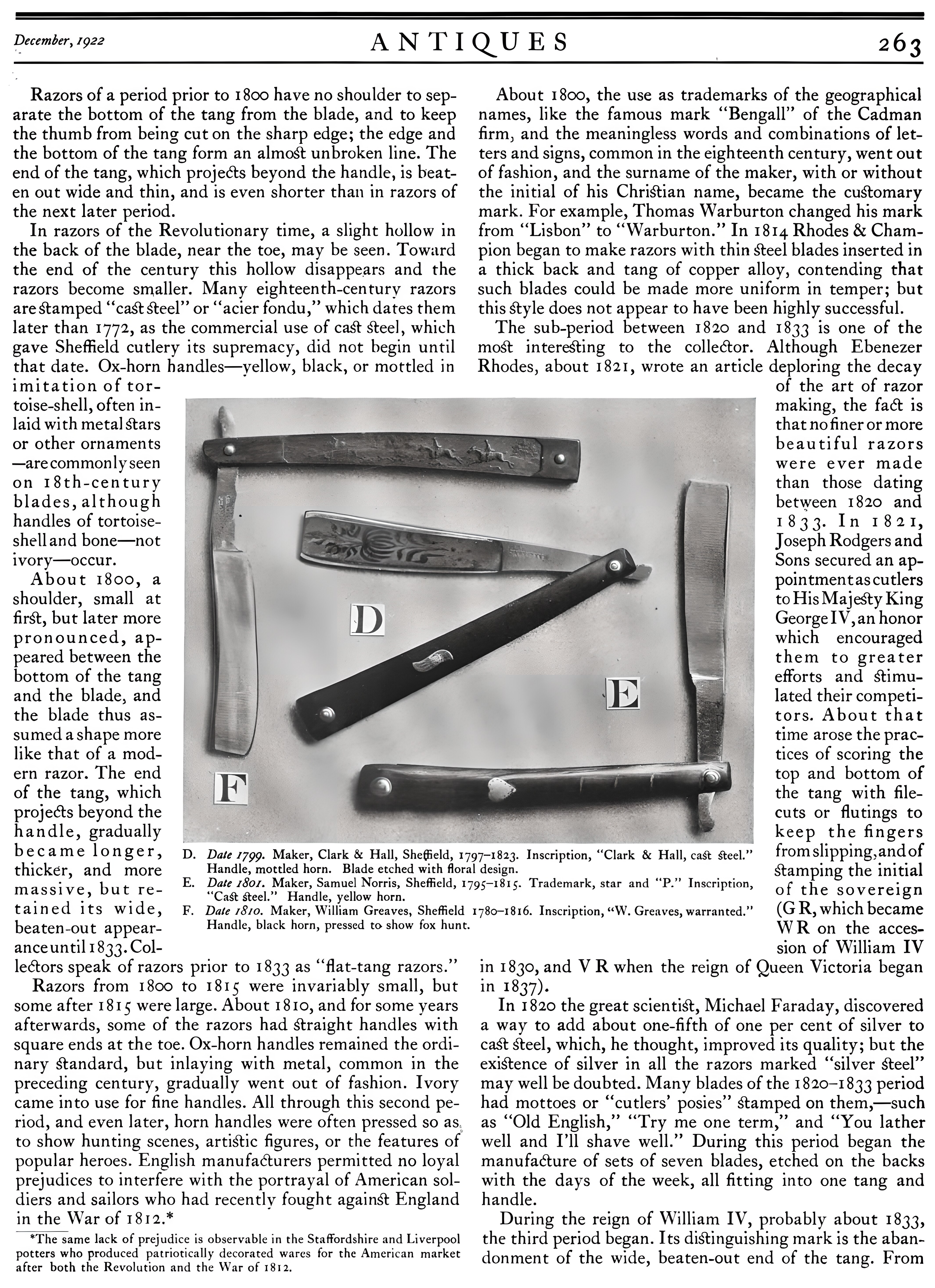 Период между 1820 и 1833 годами является самым интересным для коллекционера. Хотя Ebenezer Rhodes, примерно в 1821 году и написал статью, в которой сожалеет об упадке искусства изготовления бритв, но факт остается фактом: более изящных и красивых бритв, чем те, которые датируются периодом между 1820 и 1833 годами, никогда не производилось.