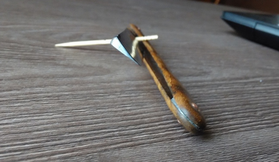 Клеймо то ли затерто, то ли не прочеканено: Улавливаю только "Черв.Хре(ст)"?? или "Перв.Хре..."? Эрль с обратной стороны без отметок, насечки нет. Ощущение что отштампован, так как грани эрля со стороны клейма несколько зализаны и имеют меньшую ширину чем противоположная грань эрля. Рукоятка зеленовато-черный пластик со следами довольно грубой ручной обработки .Клинышек метал в сером окисле (олово/свинец/алюминий). Профиль клинка- почти клин.
