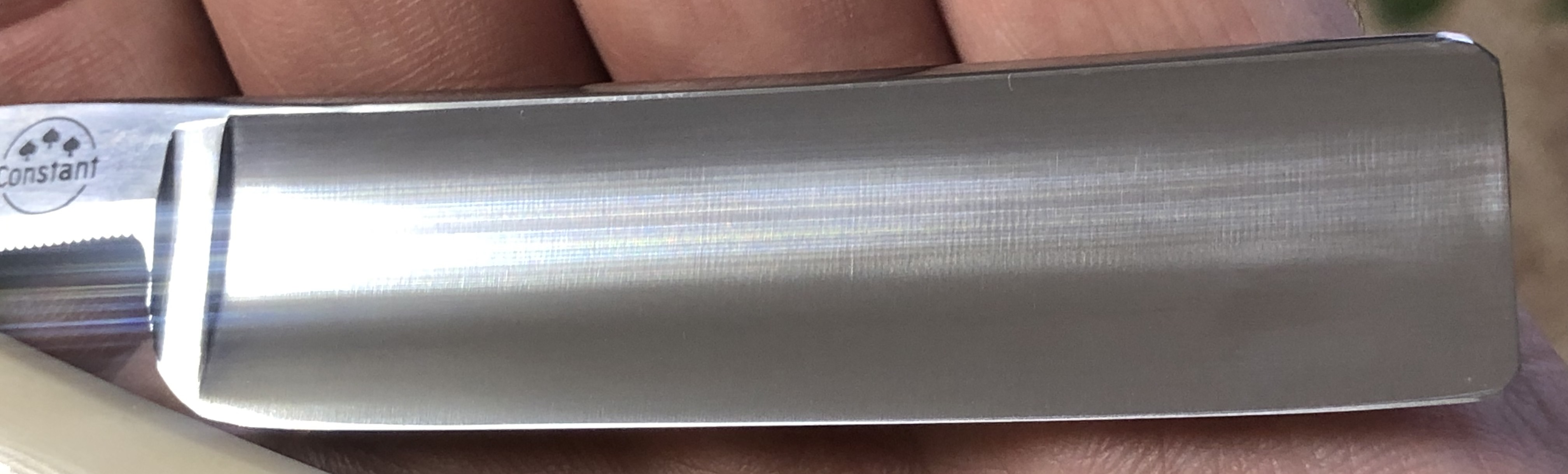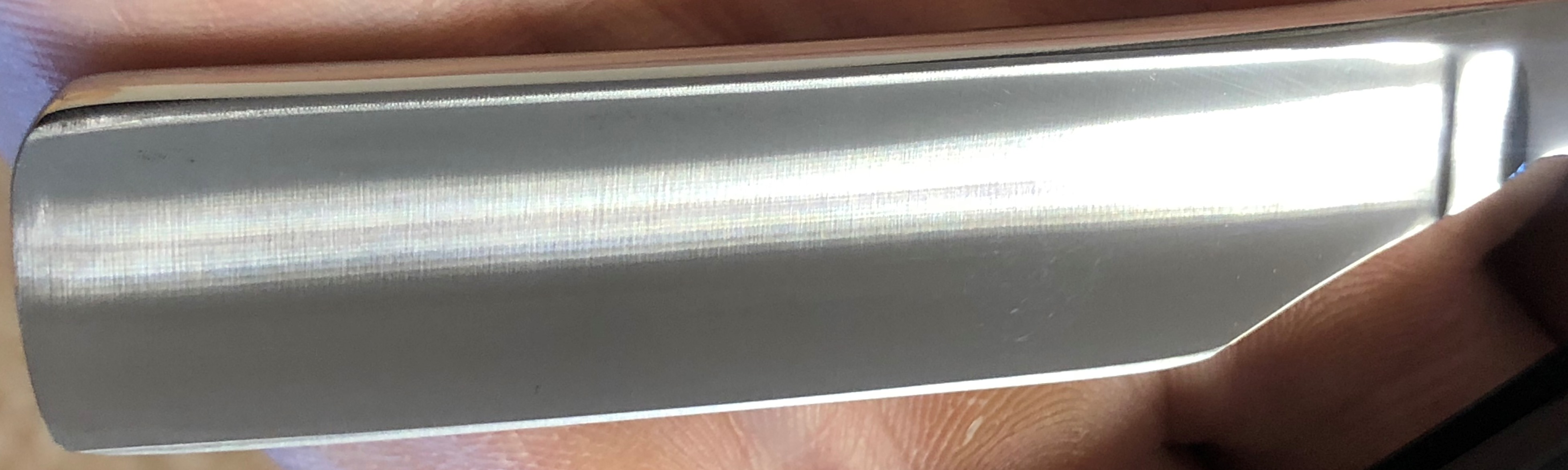Бритва в очень хорошем состоянии. Не разбиралась. На самых тонких абразивах совсем немного освежил полотно от патины и небольших царапин и все.Идеальная геометрия клинка:кромочка равномерна по всей длине и практически незаметна.
