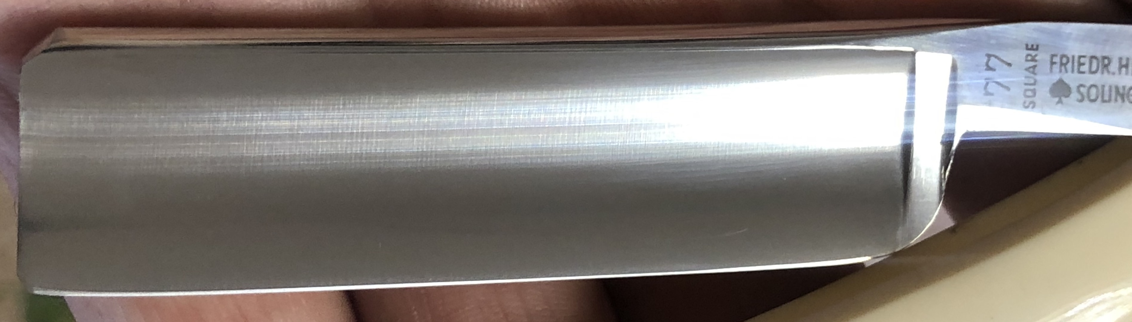 Клинок в пользовании не был.Единственно что,прошёлся тонким абразивом,дабы убрать немного окисления металла от времени.Попробовал воссоздать "родной"поперечный гринд.Идеальная геометрия полотна:кромочка равномерна по всей длине. Вместо сломанной оригинальной оправы поставил ручку от немецкого донора. Хорошая,добротная и ровная оправа.Небольшие трещинки намертво проклеены и никоим образом не повлияют на дальнейшую эксплуатацию.Немецкие двух-цветные пины, с добавлением внутренних шайб.Очень неплохой и недорогой рабочий инструмент, особенно для новичка.Заточена и готова к бритью.