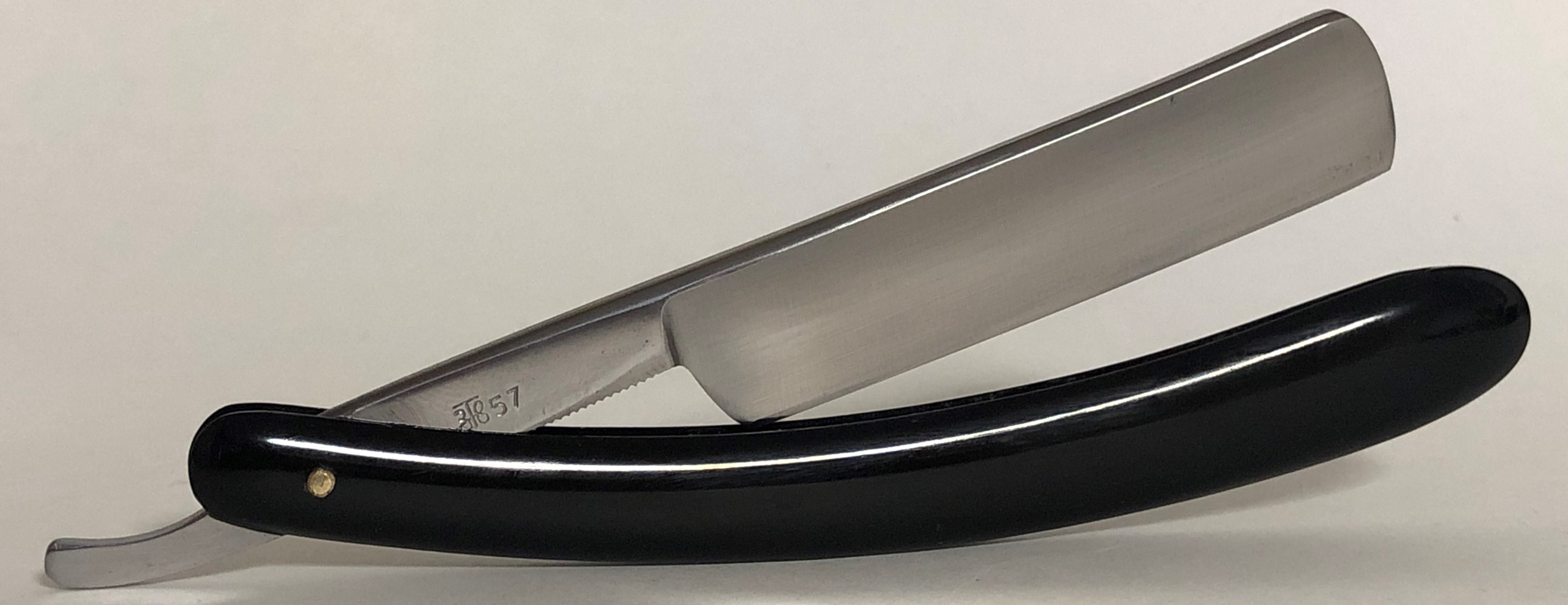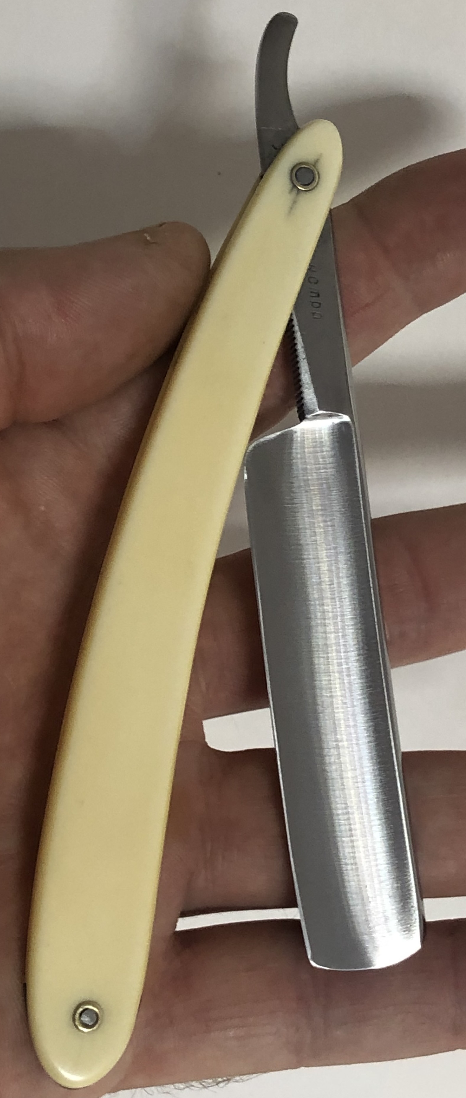 Достаточно не часто встречающаяся форма лезвия, с экстра полной вогнутостью.следов пользования не заметил.Разобрал, немного освежил металл и снова собрал.Идеальная геометрия полотна.Шведская сталь на клинке, как одна из самых удачных.Металл чистый от разного рода видимых дефектов.Отличная парикмахерская бритва, для профессионального использования, способная выдавать очень качественное и чистое бритьё.