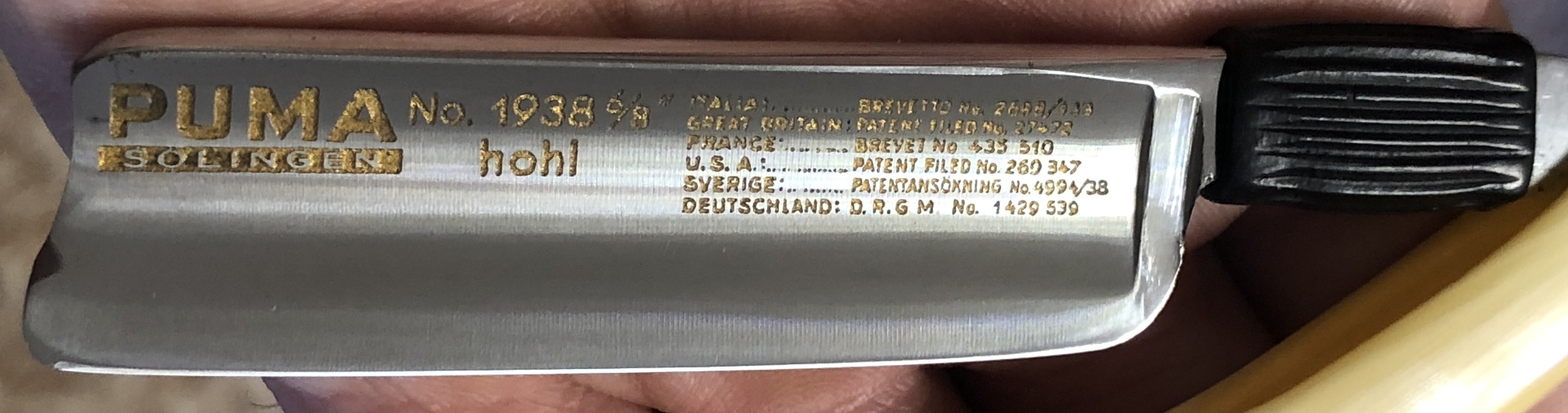 Клинок в пользовании не был.Единственно что,прошёлся тонким абразивом,дабы убрать немного окисления металла от времени.Попробовал воссоздать "родной"поперечный гринд.Идеальная геометрия полотна:кромочка равномерна по всей длине. Вместо сломанной оригинальной оправы поставил ручку от немецкого донора. Хорошая,добротная и ровная оправа.Небольшие трещинки намертво проклеены и никоим образом не повлияют на дальнейшую эксплуатацию.Немецкие двух-цветные пины, с добавлением внутренних шайб.Очень неплохой и недорогой рабочий инструмент, особенно для новичка.Заточена и готова к бритью.