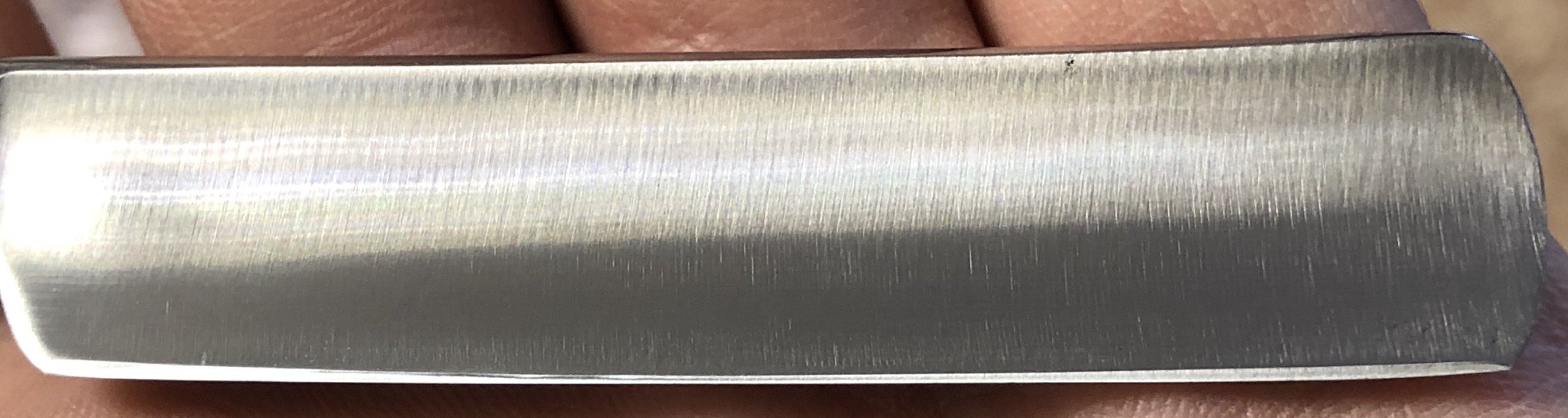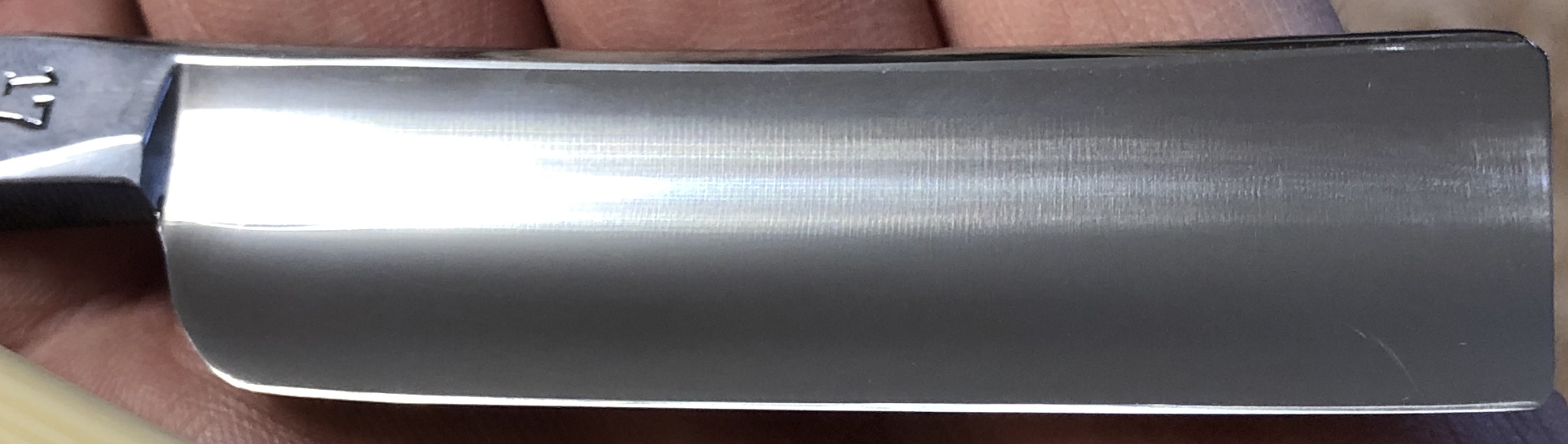 Бритва с немного неестественной формой лезвия именно для японцев."Горбатый"обушок , вкупе с тонким эрлем и средними размерами клинка смотрится очень даже неплохо.Бритву разобрал, почистил полотно и снова обрал, предварительно проклеив трещинку на ручке у нижнего пина.Сталь и кромка чистые от разного рода видимых дефектов.Идеальная геометрия клинка. Кромочка равномерна по всей длине.Удобная, вёрткая, с отличной сталью бюджетная бритва. Заточена и готова к бритью.