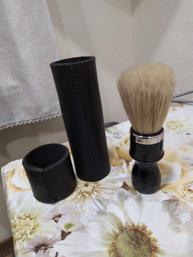 Процесс изготовления изделий околобритвенной тематикиТакой вот футляр для помазка пошил в свободный вечер из чапрака. Толщина около 5мм, нить вощеная 1мм. Дна нет. Помазок загружается ручкой вперед через верх, извлекается выталкиванием через низ. Опробован в поездках, неудобств не выявлено