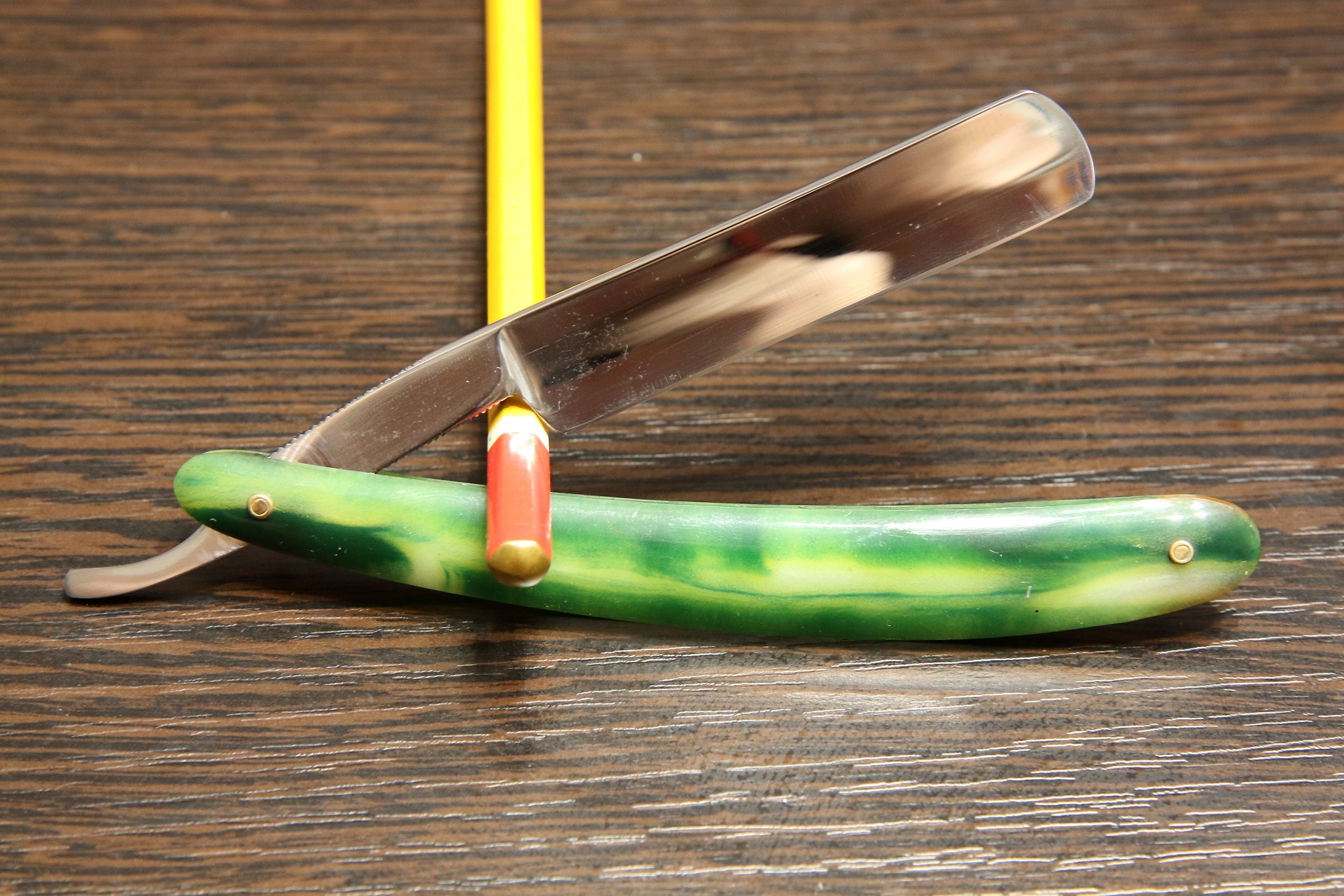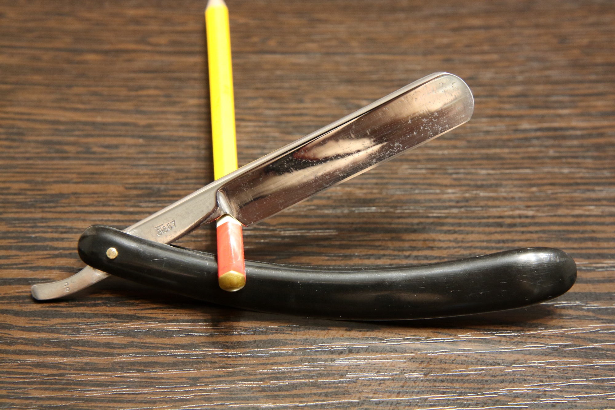 Опасная бритва Экстра, завод Труд (ЗТ) Вача, 1952 год. Ширина полотна 17.5 мм, ручку заменил, поставил от какой то другой бритвы, похожа на самодельную. Пришла почти без следов коррозии, почистил пастами и заточил. Подготовлена мной к бритью. Достаточная ширина, удобная форма, сталь неплохая, при всем этом, носит демократичный ценник. В закрытом виде, кончик пятки чуть виднеется. Цена - руб.