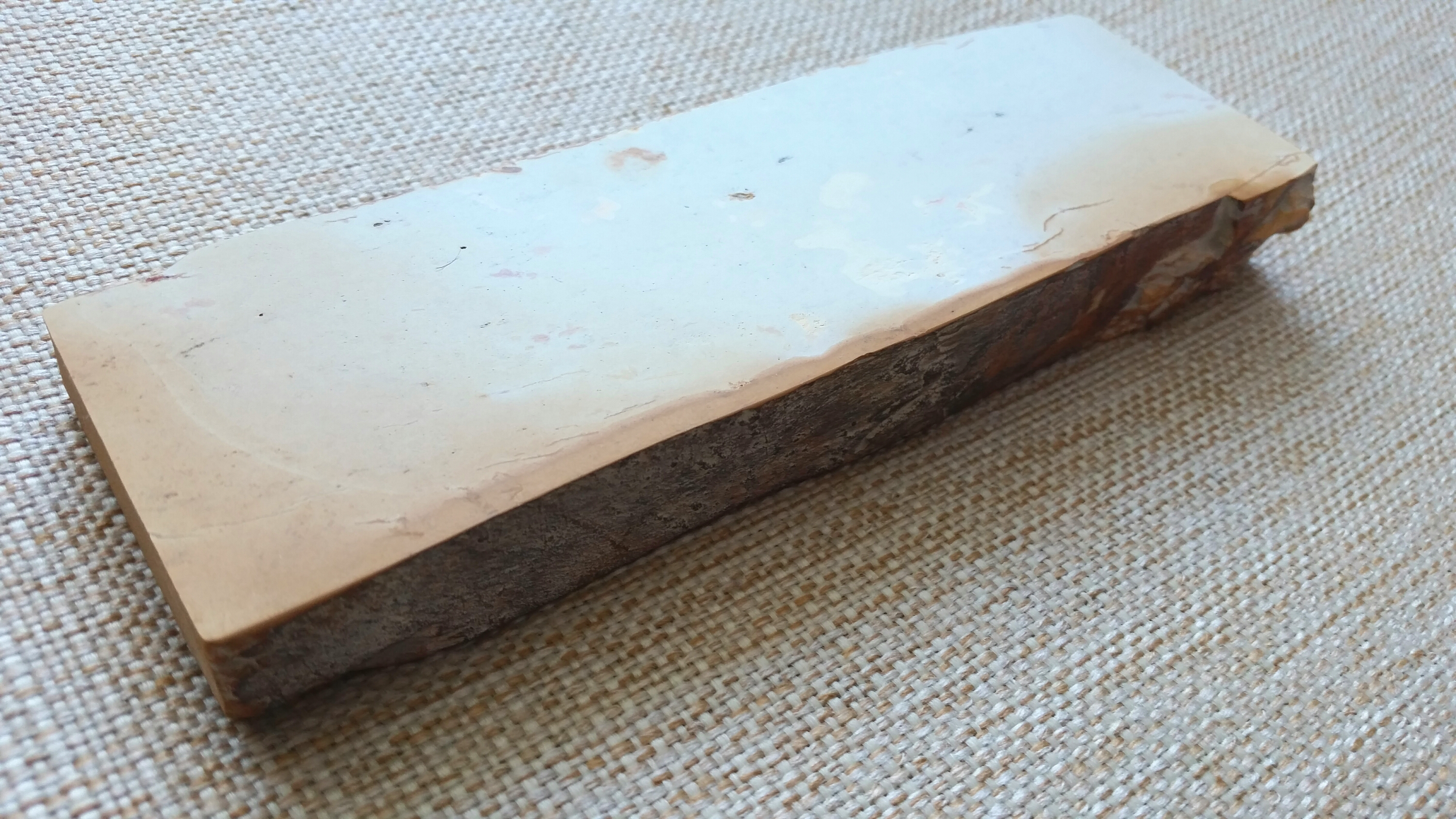 Натуральный японский камень Суита, предположительно Охира Ренге. Размеры 197×60×23 мм (со снижением толщины до 19 мм к другому концу). Твердость светлых участков 3.5, рыжих 4. Камень очень быстрый, с суспензией ботан выводит риску от 1000 за 5-6 минут. При этом, работает тонко, в районе 7-8 тыс грит. На поверхности есть две каверны, присущие Суитам, на фото видно, мне на предфинише бритв не мешали. Можно и под ножи пользовать, М390 и S90V берет без проблем. Бритва лежит для масштаба и не продается. Если к нему нужен слурик япната, то +500 руб. Цена самого камня - руб.