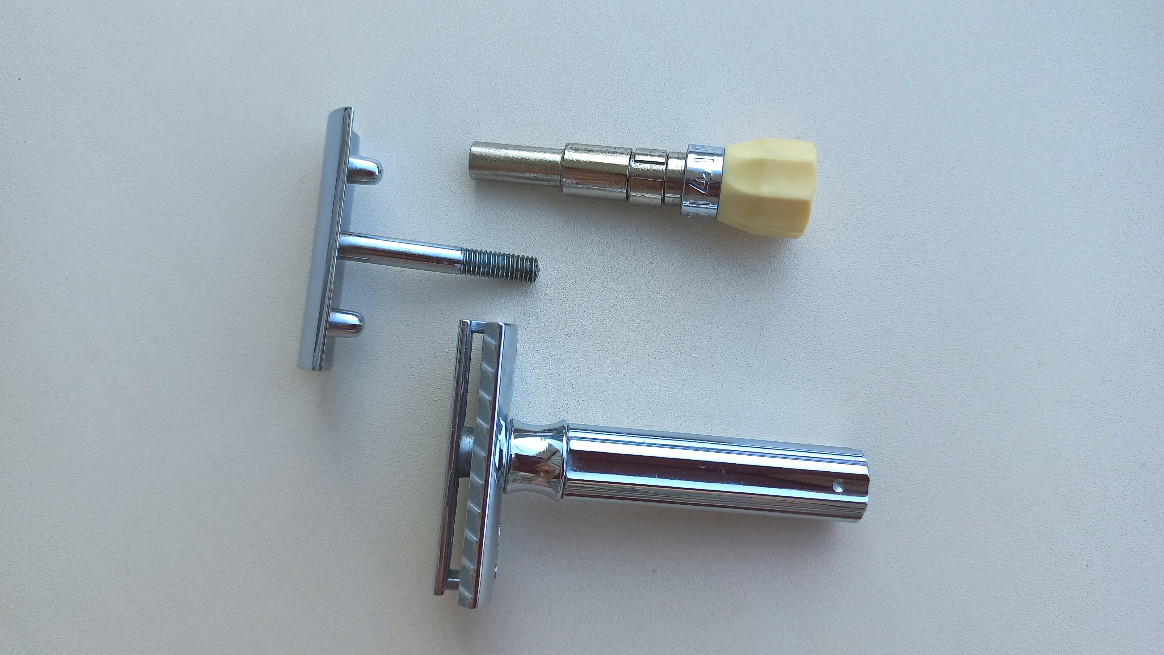 Сделан в Германии (Золинген), классика с 1955 года. Станок регулируемый, от 1 до 5+ позиции (с любыми промежуточными значениями). Регулируя угол, вы можете сильно изменить характер бритья от "опасного" до "мягкого". Станок в очень хорошем состоянии (на верхней крышке есть несколько микрочерточек от использования, видимых под определенным углом), внутри все в порядке (смазывал). Цена - руб.