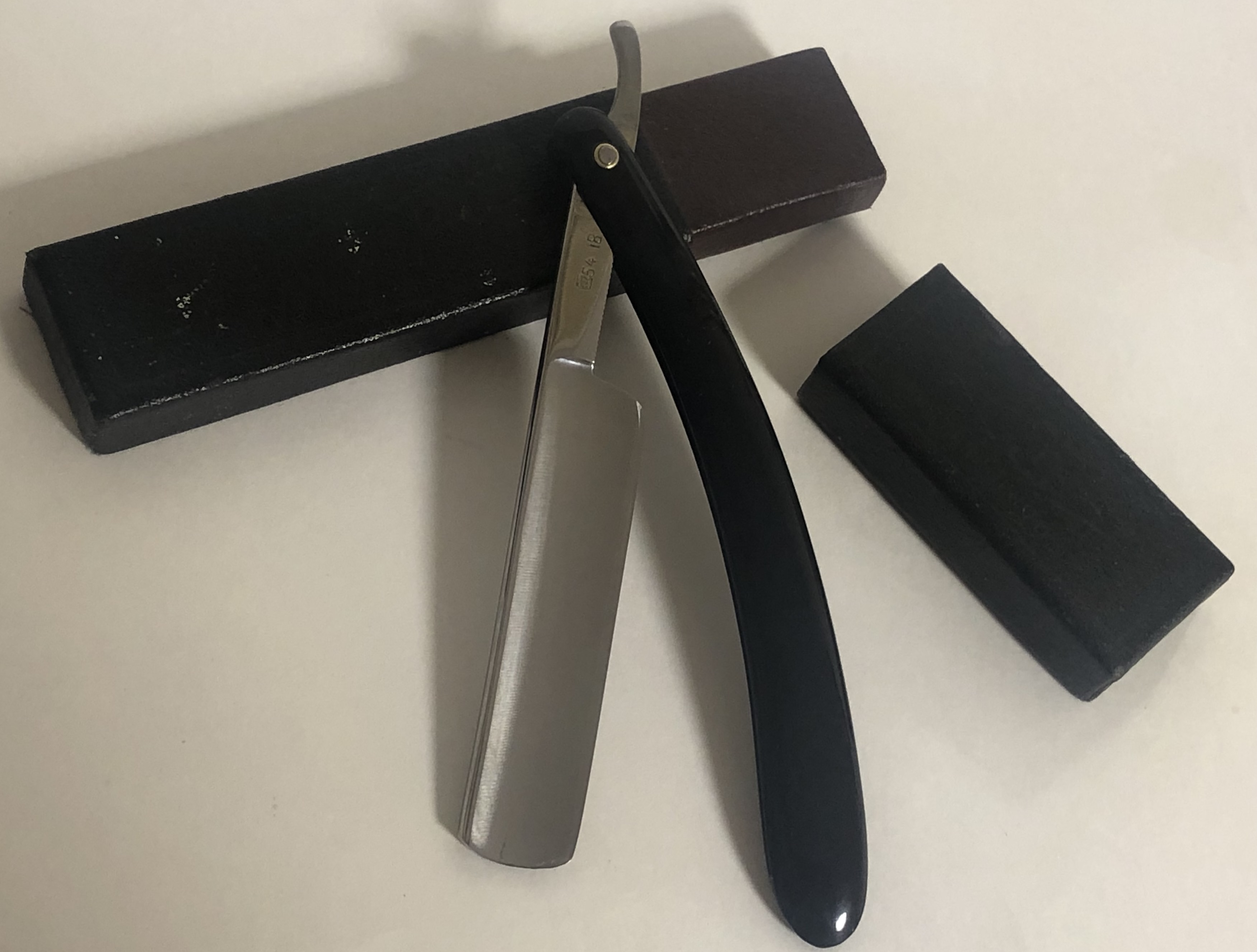 Бритва в прекрасном(по всей видимости непользованном) состоянии.Разобрал, почистил в районе осевого пина, заодно и перебрал оба пина и заново установил, с добавлением внутренних шайб.Клинок идеален по многим параметрам:чистая сталь, идеальная геометрия полотна, с равномерной и практически незаметной кромочкой.Мощная и надёжная трёх-пиновая оправа.Тяжёлая бритва, что очень хорошо, особенно для новичков.Бритва представляет собой классический японский строй, созданный в евро стиле."Звонкая", качественная углеродка способна выдавать качественное и мягкое бритьё. Заточена и готова к бритью.