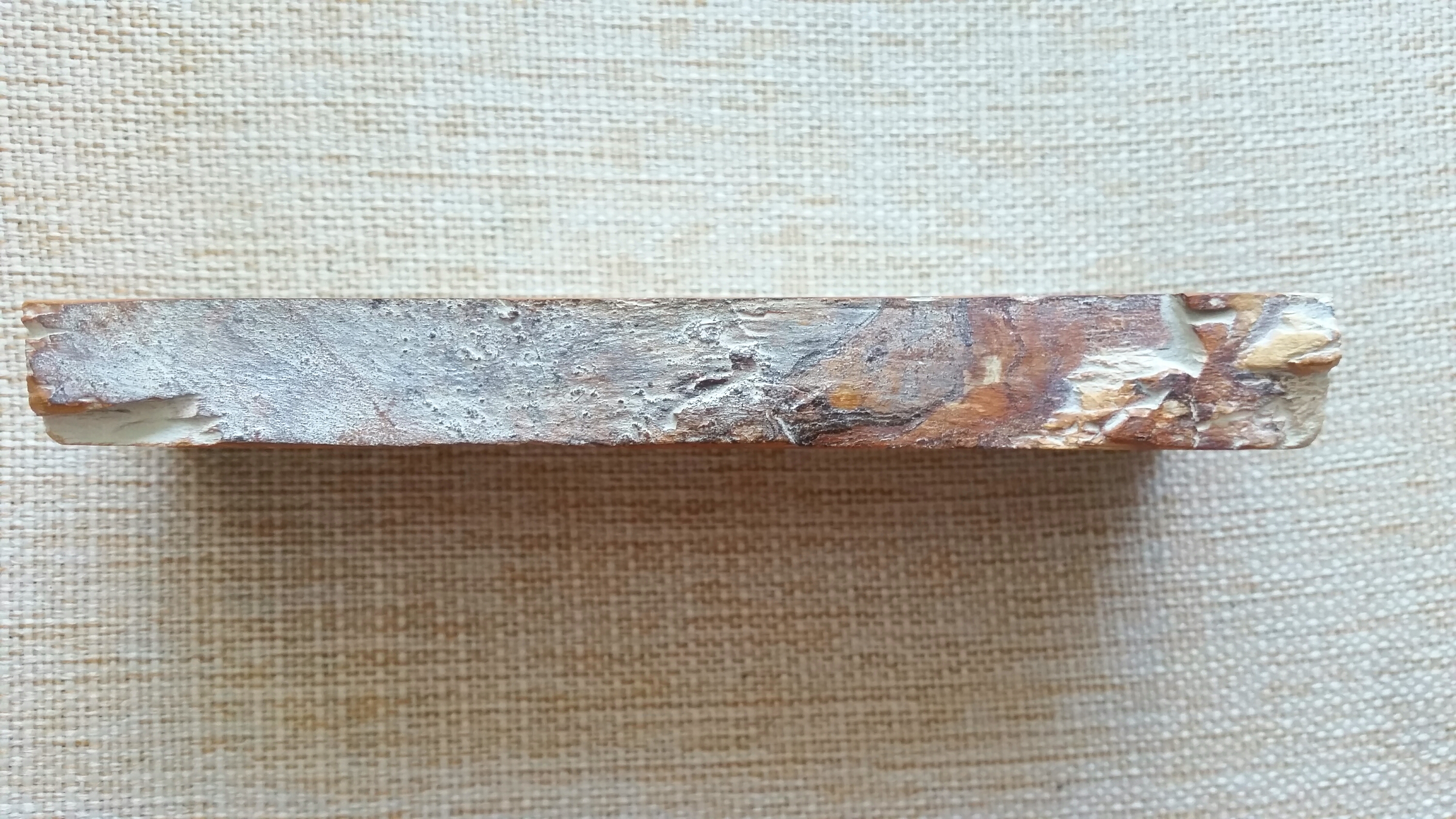 Натуральный японский камень Суита, предположительно Охира Ренге. Размеры 197×60×23 мм (со снижением толщины до 19 мм к другому концу). Твердость светлых участков 3.5, рыжих 4. Камень очень быстрый, с суспензией ботан выводит риску от 1000 за 5-6 минут. При этом, работает тонко, в районе 7-8 тыс грит. На поверхности есть две каверны, присущие Суитам, на фото видно, мне на предфинише бритв не мешали. Можно и под ножи пользовать, М390 и S90V берет без проблем. Бритва лежит для масштаба и не продается. Если к нему нужен слурик япната, то +500 руб. Цена самого камня - руб.
