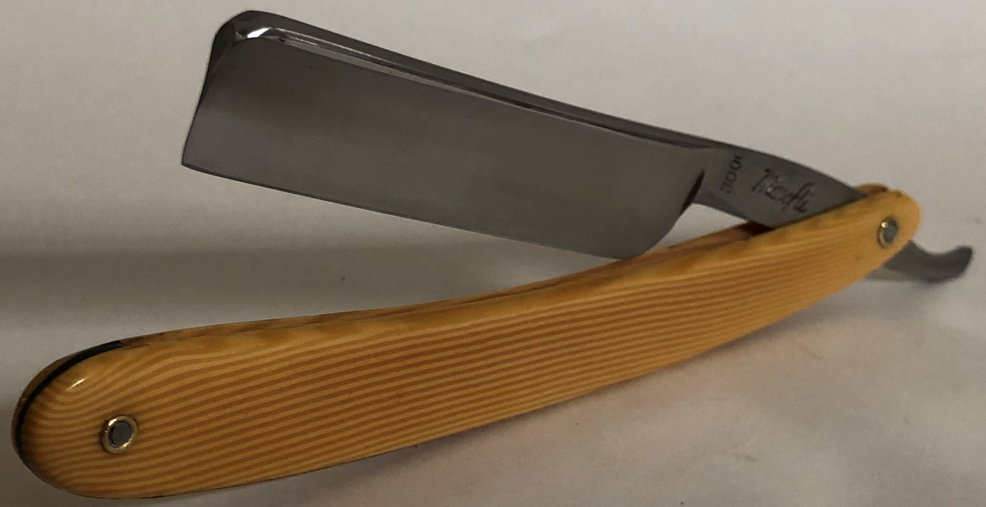 Бритва по всей видимости в пользовании не была, но пришлось разобрать, почистить металл без фанатизма и в меру своих возможностей.Кое какие малозначительные "следы времени" остались, но никоим образом не повлияют на дальнейшую эксплуатацию.Бритва профессиональная, "для парикмахерского использования".Идеальная геометрия полотна:кромочка равномерна по всей длине и практически незаметна.Отличная "звонкая" сталь, средней твердости, способна выдавать качественное и мягкое бритье.Пины заменил на немецкие втулки, с добавлением внутренних шайб.Бритва идеальна , исходя из формулы-цена/качество.Заточена и готова к бритью.