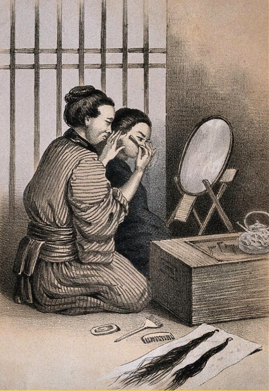 „A communal bath house: women and children washing, вuddhist nun shaving himself” „Коммунальная баня: женщины и дети моются, буддийский монах бреется” Взглянем поближе: С 2013 г. с кайфом бреюсь опасной бритвой пять раз в неделю, в три прохода.