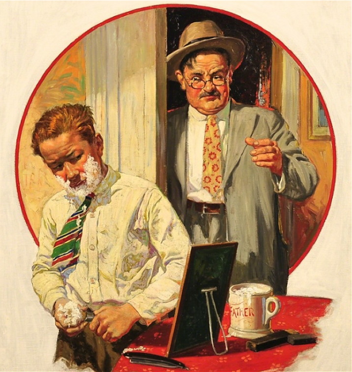 „The first shave” „Первое бритье” 1934 г. Отец смотрит на сына с испугом. Взглянем поближе: С 2013 г. с кайфом бреюсь опасной бритвой пять раз в неделю, в три прохода.