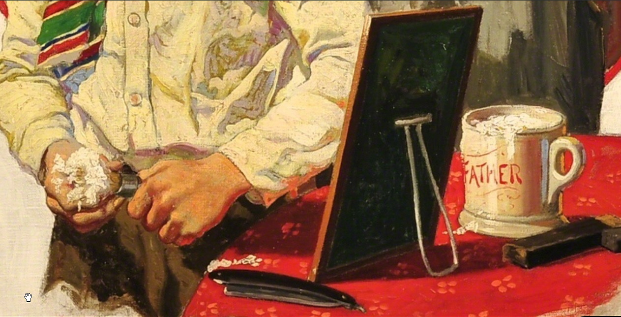 „A Private Shave” „Личное бритье” Закосив глаза он бреется, глядя на отражение в ведре воды. С 2013 г. с кайфом бреюсь опасной бритвой пять раз в неделю, в три прохода.
