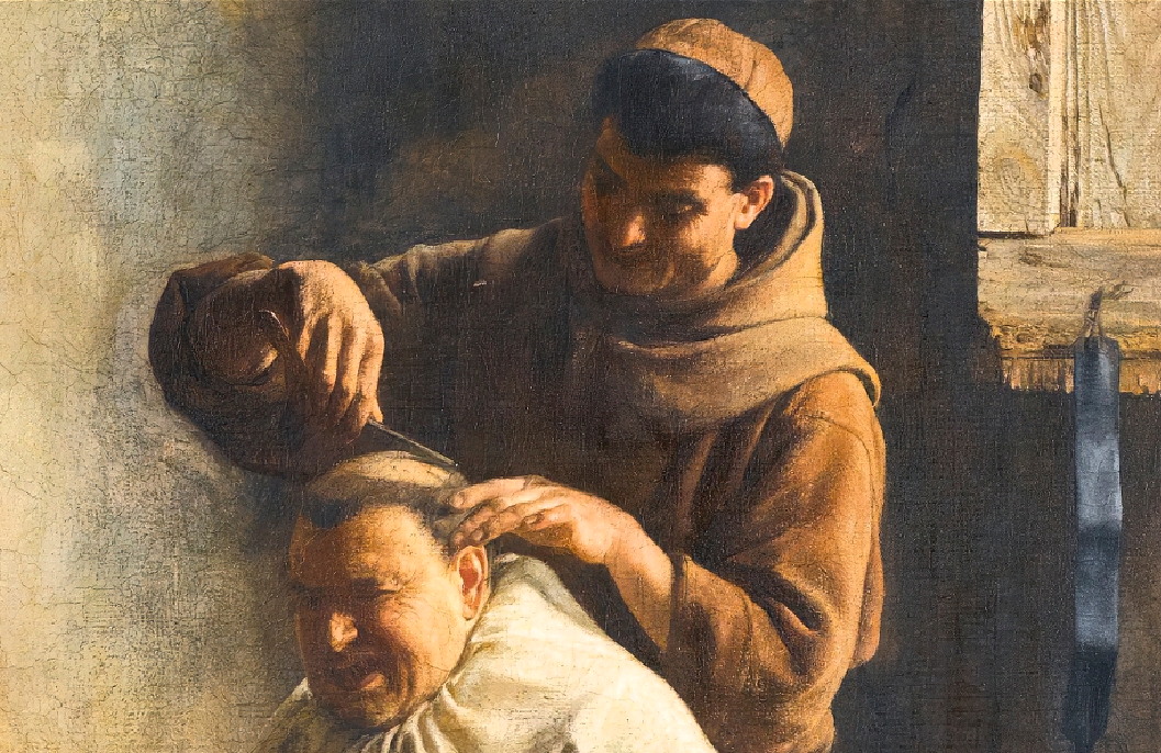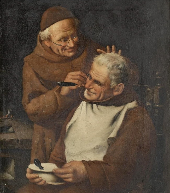 Eduard von Grutzner (1846-1925) Эдуард фон Грютцнер - германский художник. Более всего известен жанровыми картинами, изображающими жизнь монахов. „Shaving Day at the Monastery” „День бритья в монастыре” Взглянем поближе: