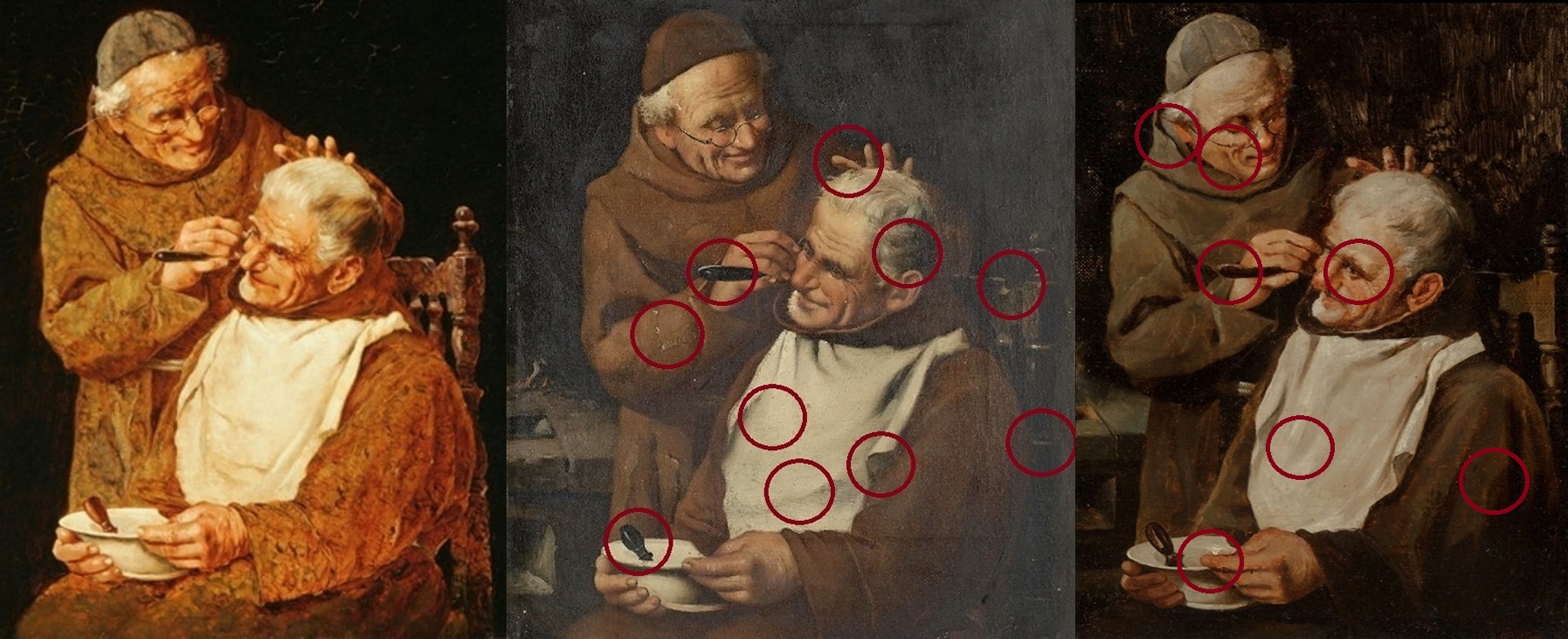 Олег Бритва, сегодня покажу уникальную вещь. Арнальдо Тамбурини написал трех разных картин с одинаковым сюжетом, с одного ракурса и с одними и теми же главными героями! Первая картина: „A holy close shave” „Святое гладкое бритье” Вторая картина: „A Close Shave” „Гладкое бритье” Третья картина: „A Close Shave” „Гладкое бритье” Вот всех трех картин рядом, в виде триптиха: Обратите внимание, что между ними есть отличия: