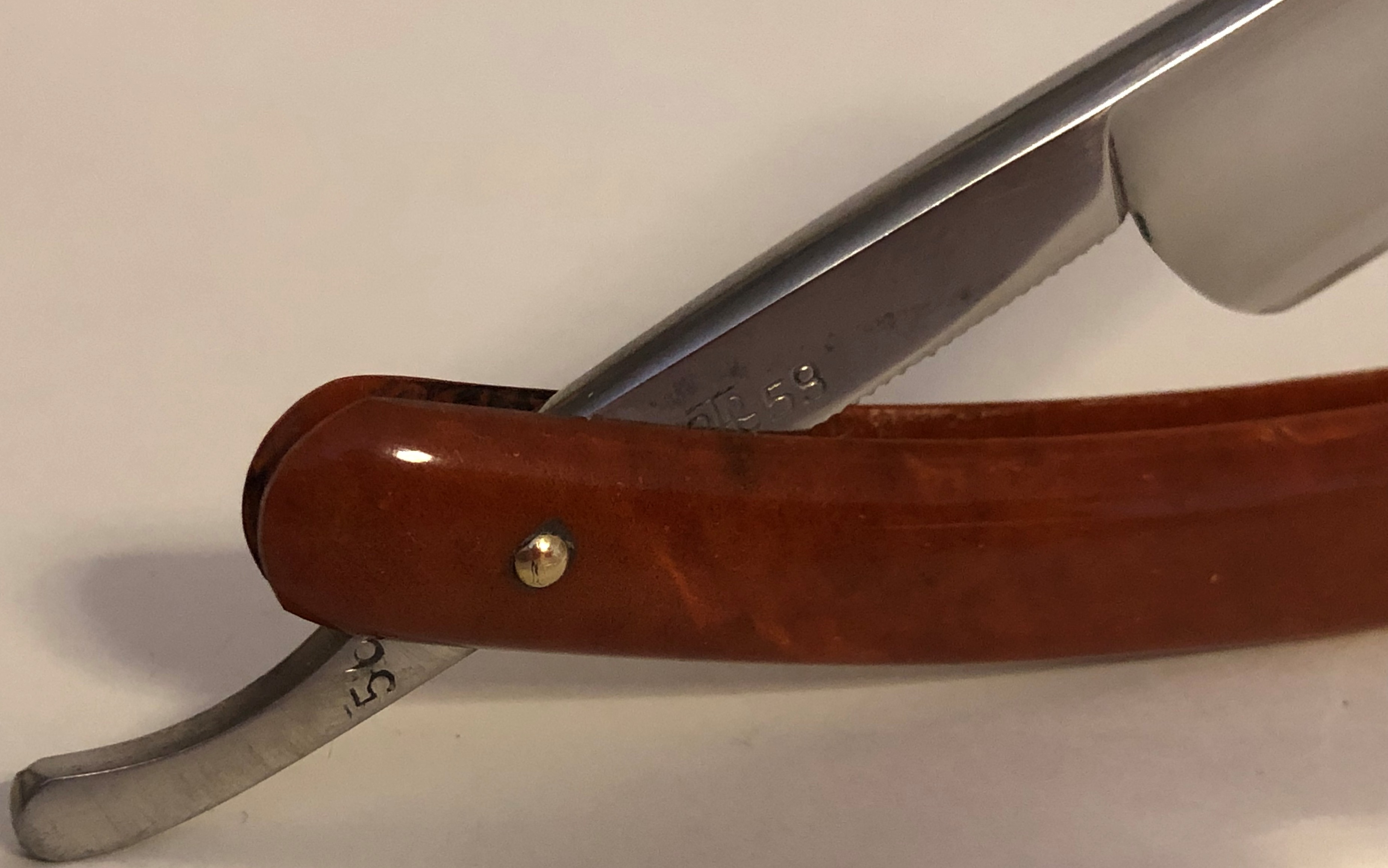 Клинок в очень хорошем и по всей видимости непользованном состоянии.Ручку оригинальную снял и поставил самодельную,от какой то советской бритвы, ручной работы.Материал-прозрачное орг-стекло.Как раз клиночек хорошо зашел в свой новый сюртук. Бритва будет неплохим рабочим инструментом, без какой либо претензии на историческую ценность. На мой взгляд, клиночек ещё долго послужит...