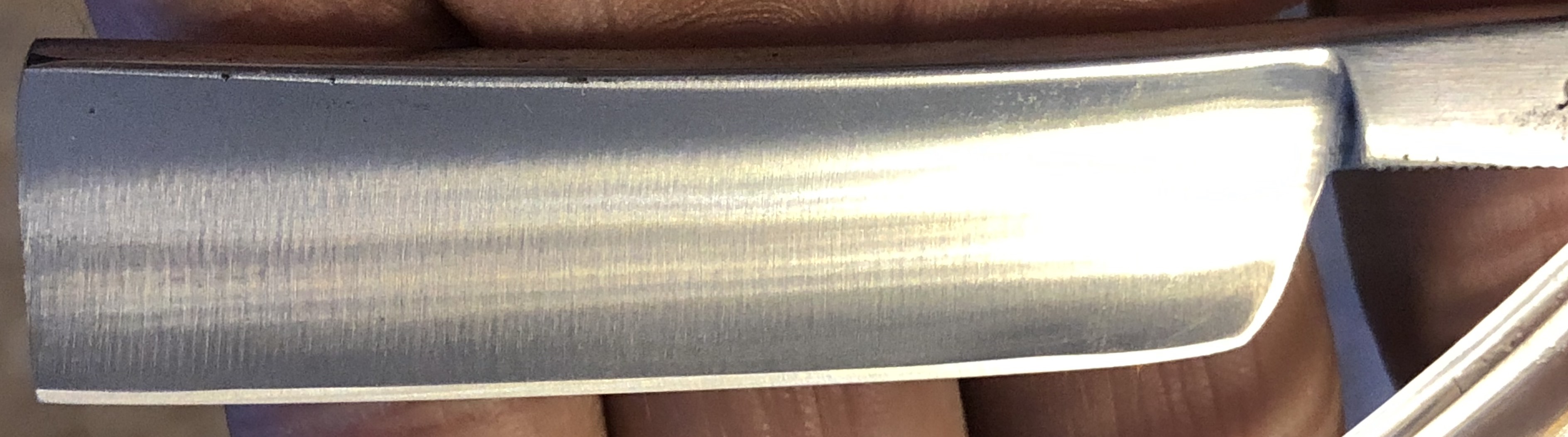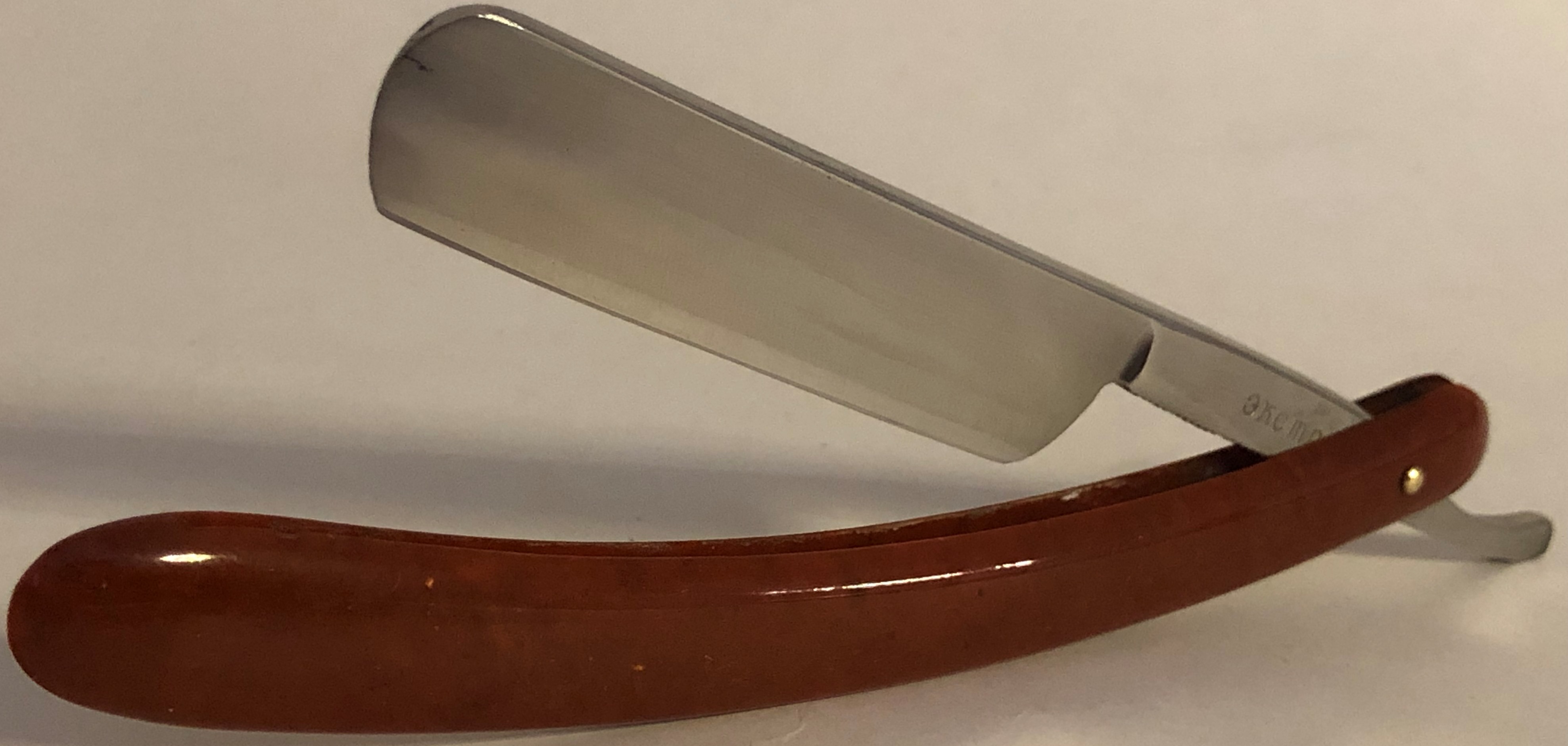 Клинок в очень хорошем и по всей видимости непользованном состоянии.Ручку оригинальную снял и поставил самодельную,от какой то советской бритвы, ручной работы.Материал-прозрачное орг-стекло.Как раз клиночек хорошо зашел в свой новый сюртук. Бритва будет неплохим рабочим инструментом, без какой либо претензии на историческую ценность. На мой взгляд, клиночек ещё долго послужит...