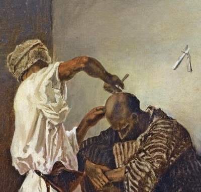 Художник „A. Dubaud” (инициалы, внизу справа) написал картину „The Barbershop” „Цирюльня” 19 век. Взглянем поближе: