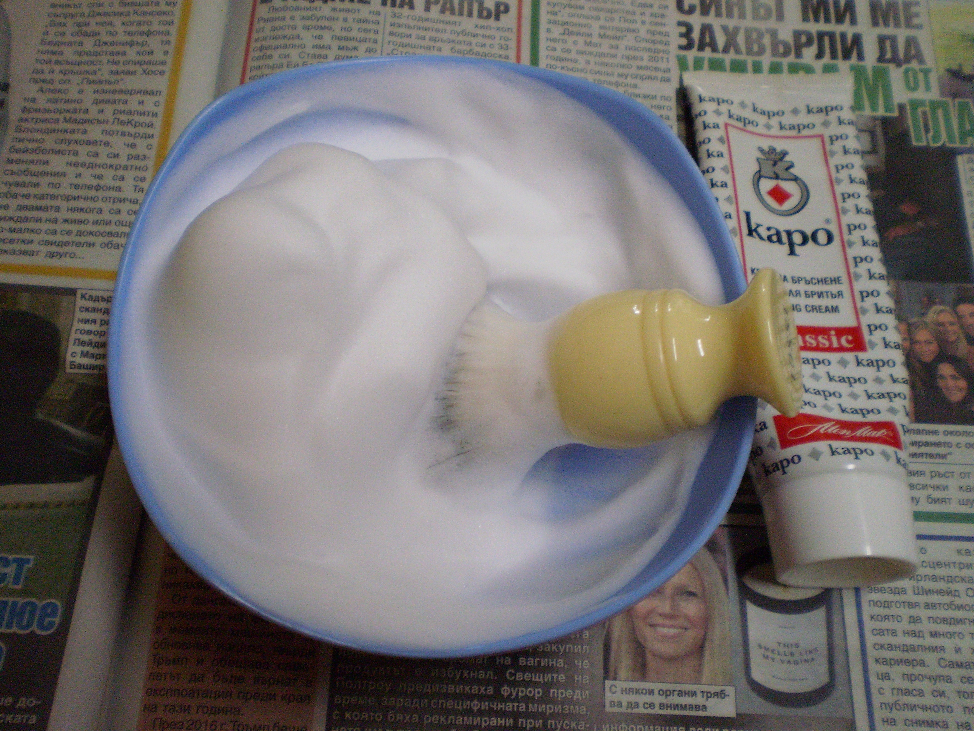 Кружка для бритьяКакие советы, о чем ты говоришь, я лишь увидел и об этом написал, не более Ты вот прямо каждый мой ответ воспринимаешь, будто я Германия, а ты СССР в 41м Плотнее надо, это дает защитную подушку, больше не надо точно. А время взбивания с ребрами уменьшается далеко не на 10 секунд. И от меня риторический вопрос - зачем покупать и клеить две хлипкие миски в одну, когда можно сразу купить одну с толстыми стенками? Этих салатников навалом, всяких. были даже миски для фруктов внутри с рельефом, вот это больше подходит для чаши Наверняка не каждому, а вот мне дано)) Змей Болгариныч, я напишу свою классификацию, она отличается от твоей и существенно. Пойдем с минимального количества воды, но везде будет достаточное время взбивания и достаточное количество мыла: 1) очень густая пена, добавлено немного воды, это похоже на очень густую сметану из холодильника, такая пена плотно ложится, без каких то мелких пузырей, просто мажется как кистью. Не подходит - очень густая, бритва в ней вязнет, очень плохое скольжение, самой пены мало 2) густая пена, добавляем в нее же около чайной ложки воды и еще чуть взбиваем. Получается уже консистенция сметаны, но пожиже, такой типа теплой, количество самой пены несколько увеличивается. Опять таки, никаких пузырей. Такая пена уже может оказаться очень годной, улучшается скольжение, бритва не вязнет, но скользить может по прежнему не достаточно 3) достаточно густая тянущаяся пена. Еще чуть воды, немного взбиваем. Можем получить уже мой любимый вариант, когда пена еще довольно плотная, но при этом уже приобретает хорошую тягучесть, тянется в усы, отлично размазывается по лицу, обладает лучшей укрывистостью. Естественно, ни о каких пузырях, даже мелких, речи идти не может, пузыри это зло, как и воздушные шапки с большими объемами 4) с некоторым объемом, но все еще годная. Если еще добавить воды, то пена уже будет приобретать избыточный объем и терять в плотности. Скольжение может еще вырасти, но ухудшается защитная подушка, несколько пропадает укрывистость, я обычно говорю - воды перелил. В этом случае, можно еще повзбивать и добавить мыла, если моло позволит, то пену еще можно спасти 5) воздушная пена, как шапка, обладает большим объемом, наколотить ее можно реально так, что из миски будет торчать. Такая пена уже имеет не плотную структуру, а состоит из множества мелких пузырей, обладает плохой укрывистостью и очень плохими защитными свойствами, может быстро опадать на лице. Плохой вариант. Я это все написал для жировых мыл, которыми пользуюсь я. Но есть нюанс - далеко не из всех средств можно получить все эти стадии пены в том виде, в котором я тут описал или они могут работать не так, как я написал. Я сам стартую с малого количества воды при взбивании и каплями с пальцев подбавляю понемногу. Когда вижу, что пена начинает именно мазаться по дну чаши и хорошо ее укрывать, оцениваю, чтобы хватило мне на 2 прохода и чуть запаса, с водой останавливаюсь и еще чуть взбиваю. потом пене надо постоять минут 5 еще. Вот тогда самый цимус, такая пена не опадает и не теряет своих свойств полчаса точно Вот, нашел свою старую фотку, тут в принципе, некоторое подобие пены, которую я предпочитаю, есть усы, нет дикого объема, пластичная, мажется. Но тут само мыло не позволило сделать эту пену еще и достаточно плотной, в общем, именно плотности ей