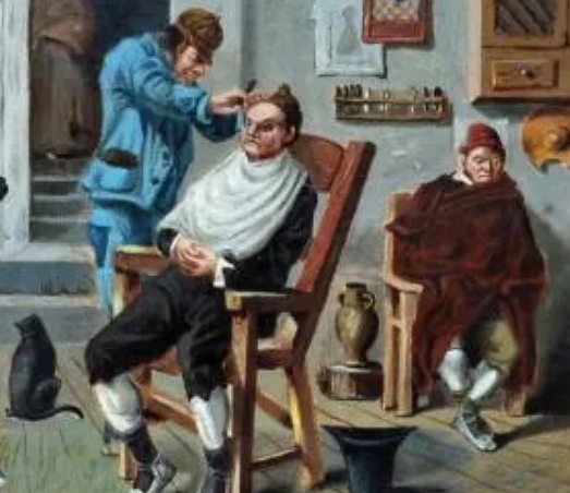 „In the Barber Shop” „В цирюльне” 17 век. Взглянем поближе: С 2013 г. с кайфом бреюсь опасной бритвой пять раз в неделю, в три прохода.