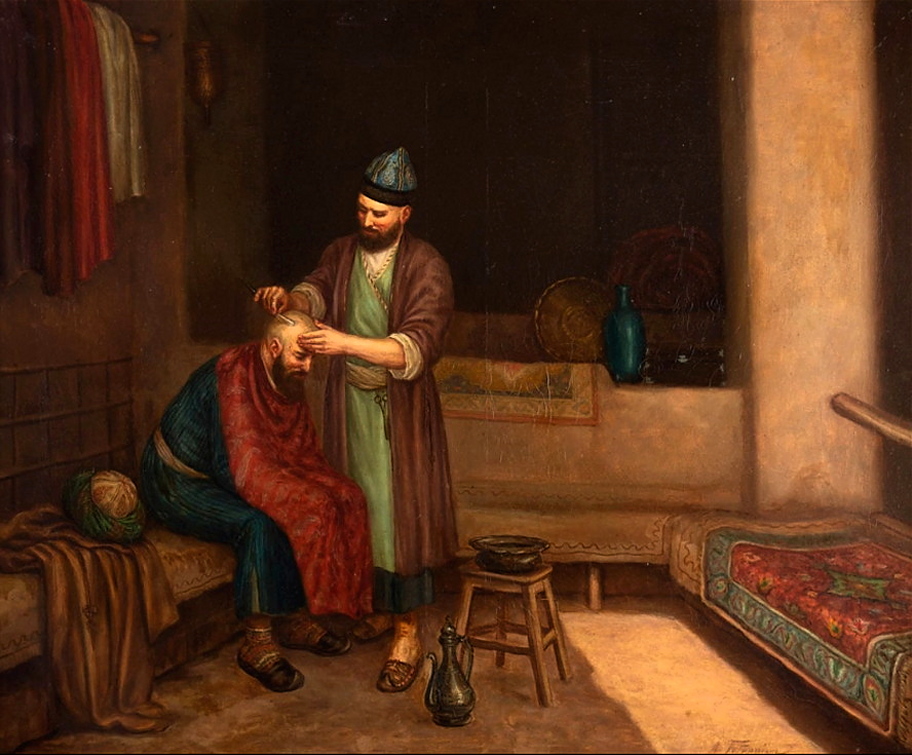 И сново Arshag Tolvanian (1880-1969). Аршаг Толванян был армянским художником. „The Turkish Barber” „Турецкий цирюльник” Взглянем поближе: С 2013 г. с кайфом бреюсь опасной бритвой пять раз в неделю, в три прохода.