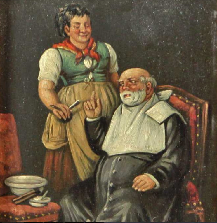 „In the Barber Shop” „В цирюльне” 17 век. Взглянем поближе: С 2013 г. с кайфом бреюсь опасной бритвой пять раз в неделю, в три прохода.