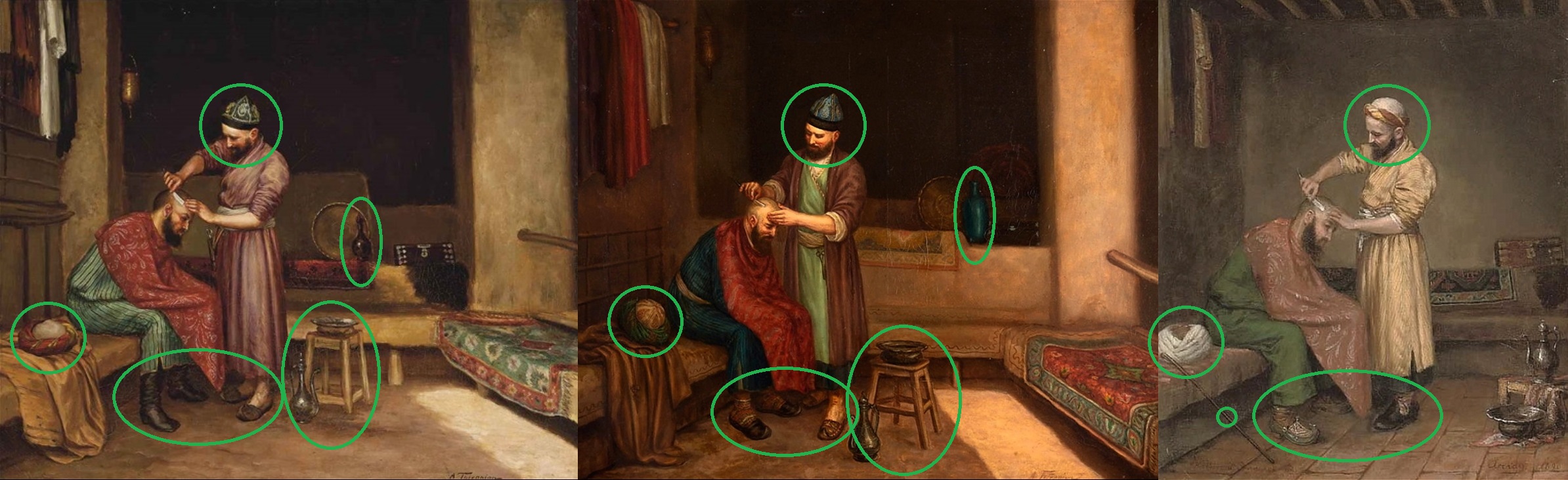 И сново Аршаг Толванян (1880-1969). „Barber in Samarkand” „Цирюльник в Самарканде” 1890 г. Взглянем поближе: Другая картина (№3) Аршага Толваняна я уже показывал: viewtopic.php?p=231685#p231685 Всех картин автор подписал внизу и при просмотре между ними есть отличия, так что Аршаг Толванян написал трех разных картин с небольшими разницами: С 2013 г. с кайфом бреюсь опасной бритвой пять раз в неделю, в три прохода.