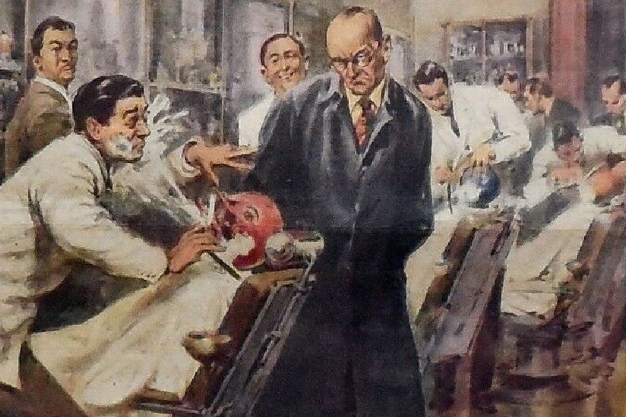 „The examination of the barbers” „Экзамен цирюльников” 1947 г. Взглянем поближе: Текст к картине: „Чтобы доказать твердость руки и безопасность начинающих парикмахеров, американская профессиональная школа подвергает молодых учеников очень оригинальному экзамену. Марионетки в форме человечков с надутым воздушным шаром вместо лица бреются. Намылив воздушный шар, ученик должен удалить всю пену бритвой, ни в малейшей степени не повредив тонкую резиновую кожу. Если ученик делает разрез, воздушный шар лопается и… прощай, экзамен!”. С 2013 г. с кайфом бреюсь опасной бритвой пять раз в неделю, в три прохода.