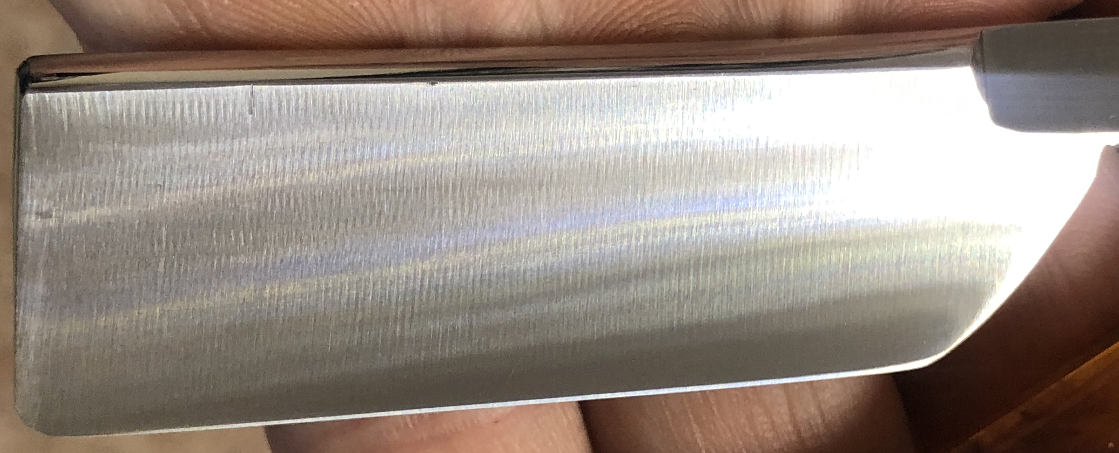 Да пусть простят меня апологеты и другие сторонники иного вИдения реставрации, но в этом случае руки не поднялись(да и особо не хотелось) вычищать такую шикарную патину на клинке, соответствующую преклонному возрасту бритвы.На мой взгляд, все получилось естественно.Итак,бритва была разобрана, немного освежено полотно от избыточного окисления.Равномерную патину оставил.Оригинальный гринд клинка сохранился.Активных следов пользования и износа обушка не замечено.Бритва была собрана, с добавлением внутренних шайб и с сохранением "родных" пинов.Идеальная геометрия полотна.Коробочка в наличии!Достойная, красивая и недорогая бритва.Не пропустите!