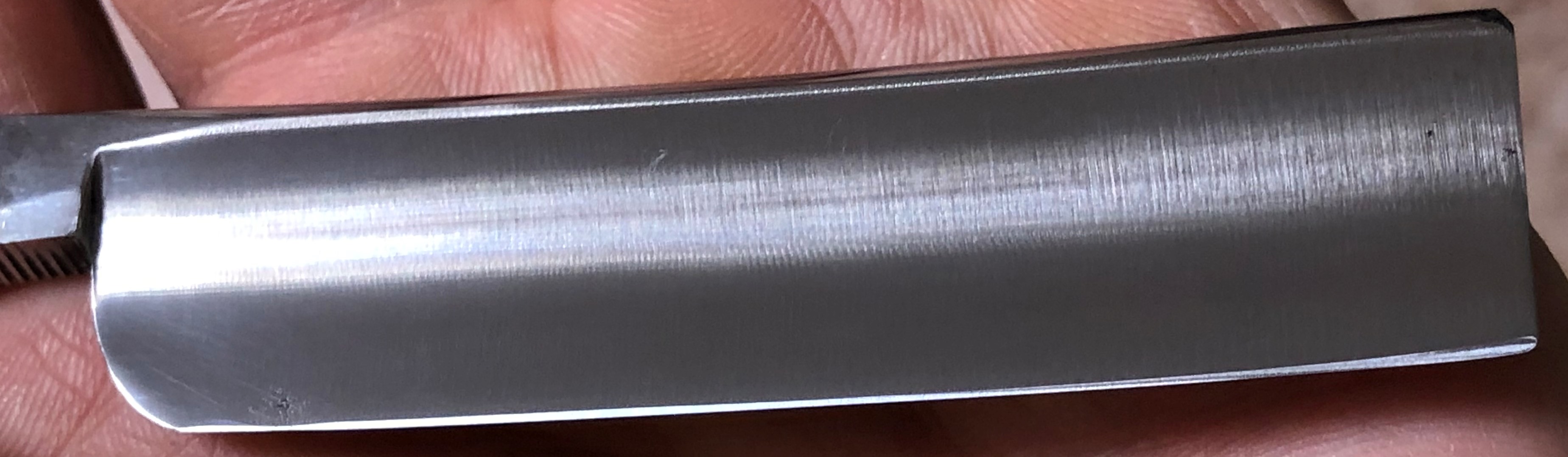 Клинок в очень хорошем и по всей видимости непользованном состоянии.Ручку оригинальную снял и поставил самодельную,от какой то советской бритвы, ручной работы.Материал-прозрачное орг-стекло.Как раз клиночек хорошо зашел в свой новый сюртук. Бритва будет неплохим рабочим инструментом, без какой либо претензии на историческую ценность. На мой взгляд, клиночек ещё долго послужит...