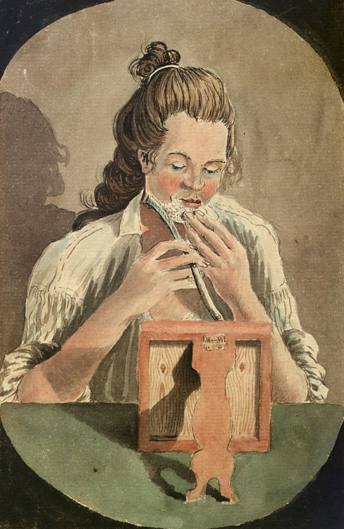 „Lieutenant Gabriel Bray shaving” „Лейтенант Габриэль Брей бреется” (автопортрет) 1775 г. Взглянем поближе: С 2013 г. с кайфом бреюсь опасной бритвой пять раз в неделю, в три прохода.