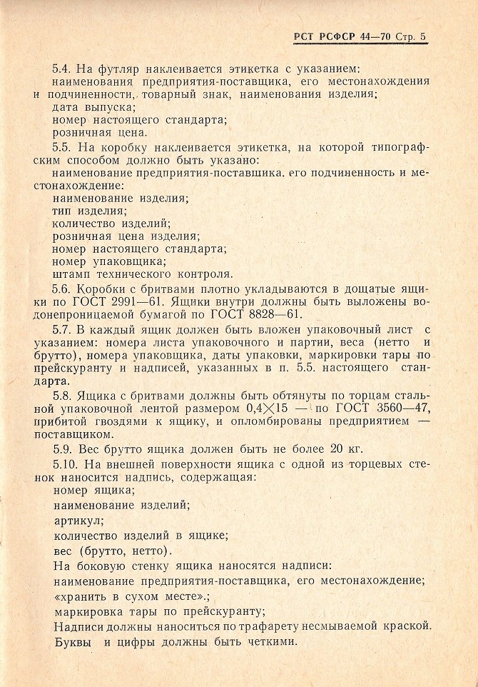 РСТ РСФСР 44-75 - дата вступления в силу: 1 октября 1976 года РСТ РСФСР 44-81 - дата вступления в силу: 1 октября 1982 года источник пока не указываю, однако данные стандарты найдены в каталоге Российской Национальной Библиотеке (Санкт-Петербург). У кого есть возможность зайти скопировать? Общие сведения по советским бритвамсрок введения установлен с 1 апреля 1970 года Основные выдержки: ТИПЫ И ОСНОВНЫЕ РАЗМЕРЫ 1.1. Бритвы по конструкции делятся на два типа: тип А — бритвы клинковые однозаковные; тип Б — бритвы клинковые двухзаковные, В зависимости от эксплуатации бритвы разделяются на парикмахерские и медицинские. Размеры бритв устанавливаются чертежами предприятия-поставщика. 2. ТЕХНИЧЕСКИЕ ТРЕБОВАНИЯ 2.3. Клинок бритвы должен быть термически обработан и иметь микроструктуру мелкоигольчатого или бесструктурного мартенсита с избыточными равномерно распределенными зернами карбидов величиной не более 2 мкм. Твердость клинка бритвы должна быть НРС 57—65. 2.5. Режущая кромка клинка бритвы должны быть острой, равномерно заточенной и направленной по всей длине, без заусенцев. Толщина режущей кромки должна быть не более 1,5 мкм. Высота неровностей и глубина впадин на режущей кромке клинка бритвы не должны превышать 3,5 мкм. Режущая кромка клинка должна находиться в плоскости, проходящей через середину его сечения. 2.6. Поверхность клинка бритвы должна быть блестящей, однотонной. Допускается разница в оттенке на ширине не более 4 мм со стороны режущей кромки. Трещины, раковины, царапины и другие поверхностные дефекты не допускаются. 2.7. Шероховатость на поверхностях, образующих режущую кромку, должна соответствовать 12 классу чистоты, шероховатость остальных поверхностей — 10 классу чистоты—по ГОСТ 2789—59. 2.8. На поверхность клинка бритвы может наноситься рисунок, надписи, расположение которых должно быть на расстоянии не менее 5 мы от режущей кромки. 2.9. Наружные поверхности ручки или плашек ручки должны быть гладкими, блестящими или матовыми. Допускается рисунок. На ручке не допускаются: трещины, заусенцы, неровности, острые кромки по контору, раковины диаметром более 0,5 мм и царапины более 5 мм длиной и 0,05 мм шириной. Количество раковин и царапин на ручке не должно быть более 3 штук. На ручке медицинской бритвы раковины и царапины не допускаются. 2.10. Цвет обоих плашек ручки должен быть одного тона. Прокладки могут отличаться от плашек как по материалу, так и по цвету. 2.11. Плашки и прокладки должны плотно прилегать друг к другу. Смещение плашек и прокладок относительно друг друга не допускается. 2.12. Клинок должен быть прочно соединен с ручкой заклепкой. Вращение клинка должно быть легкое и плавное. При закрывании бритвы режущая кромка не должна задевать за плашки ручки. В сложенном состоянии режущая кромка клинка бритвы не должна выступать за контур плашек. Самопроизвольное открывание клинка бритвы не допускается. 2.13. Концы заклепки должны быть зачеканены заподлицо с поверхностью ручки или иметь сферическую поверхность. Проверка твердости производится по ГОСТ 9013—59 в 2-х точках по длине клинка на расстоянии не менее 5 мм от режущей кромки. Проверка режущих свойств производится путем свободного срезания обезжиренного волоса, зажатого за один конец на расстоянии 10 мм от зажима. 5.1. На клинке или ручке бритвы должно быть выштамповано: товарный знак предпр
