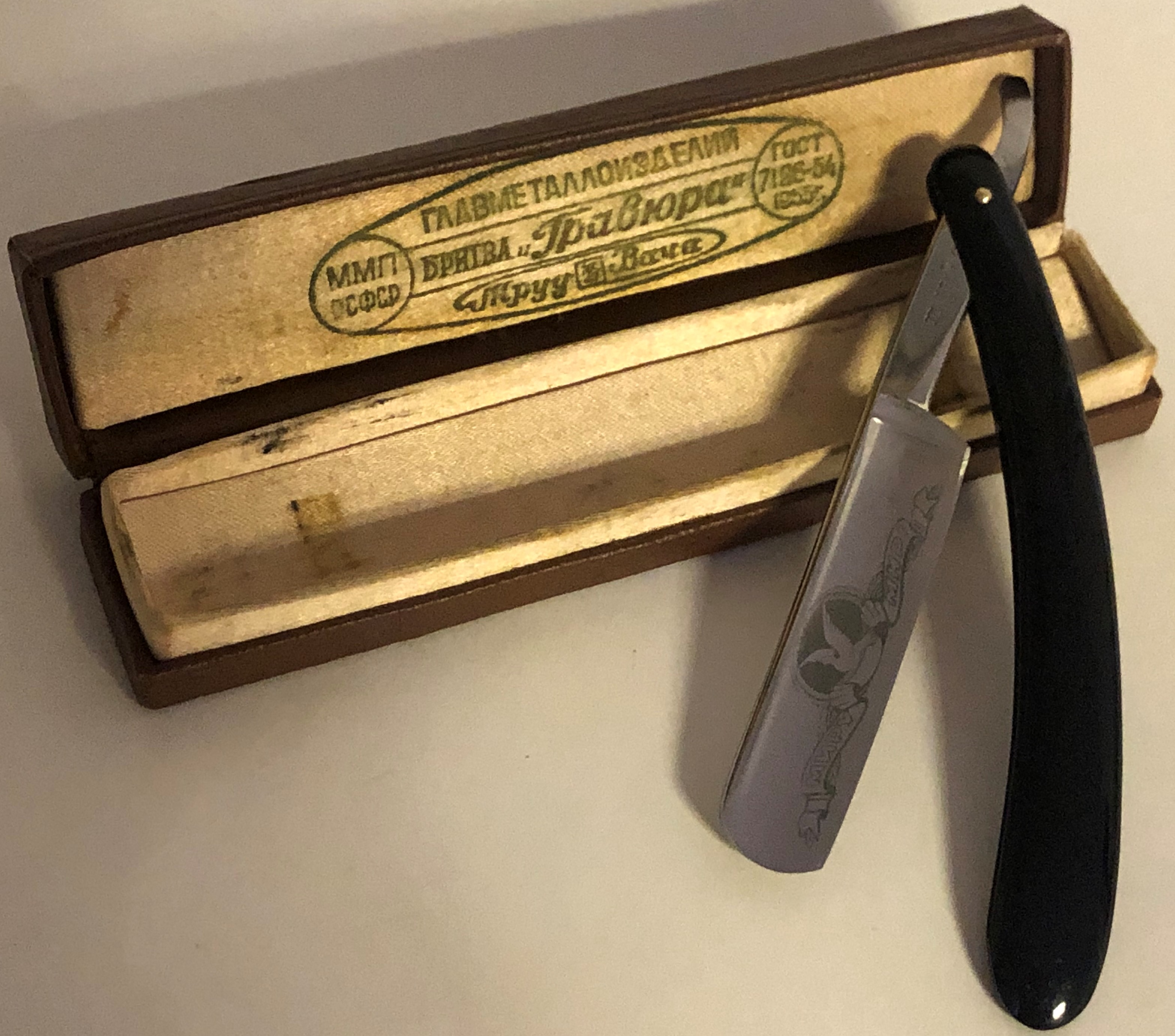 Бритва в очень хорошем состоянии.Не разбиралась и не ремонтировалась. Заводская шлифовка и полировка клинка. Имеются остатки от заводской электро-химической заточки.Идеальная геометрия полотна. Сталь чистая от разного рода видимых дефектов.Картинка на полотне четкая и совершенно без потертостей.Родная коробочка в комплекте!!Заточена и готова к бритью. Отличная коллекционная и достаточно редкая вещь!