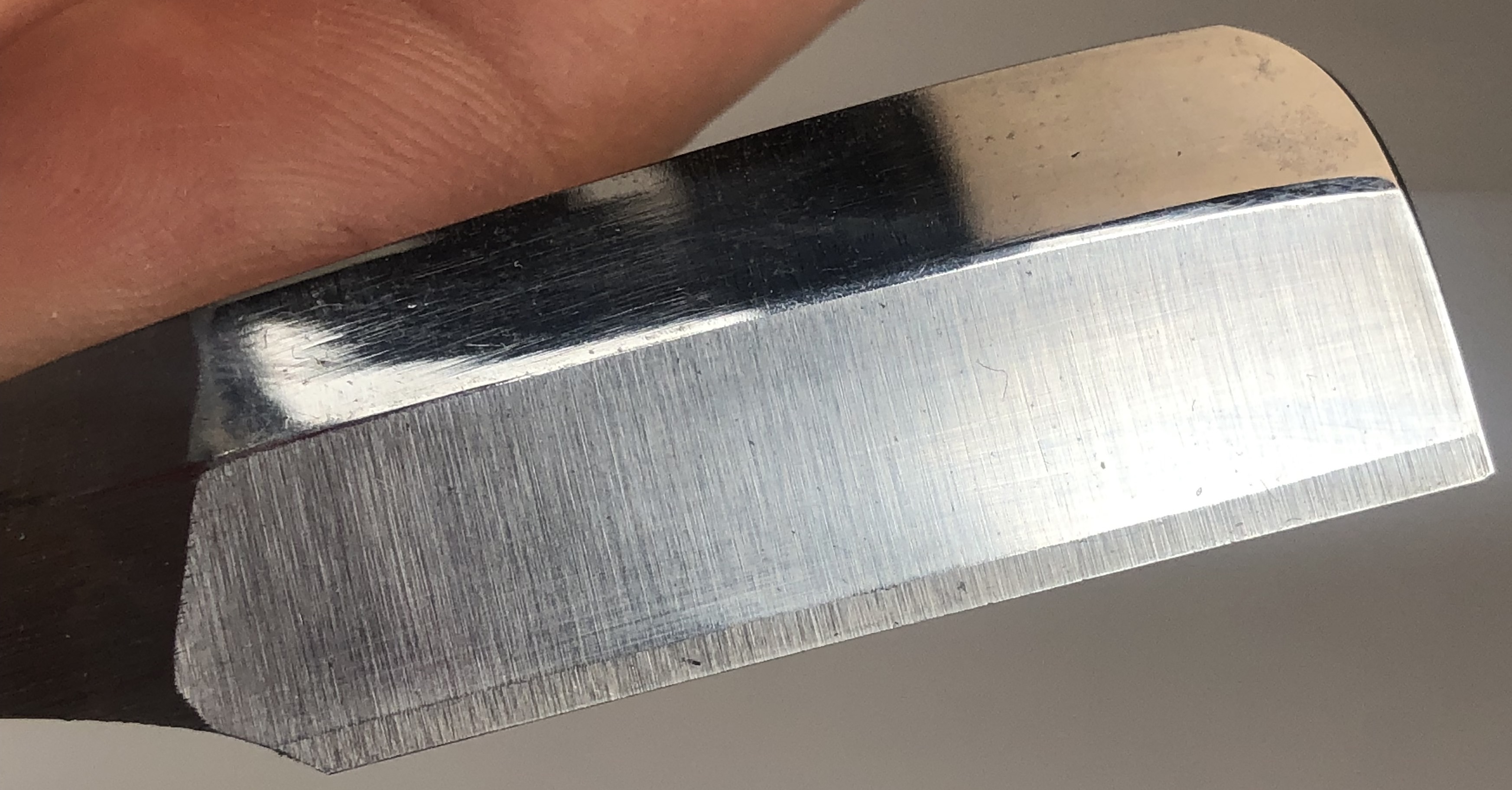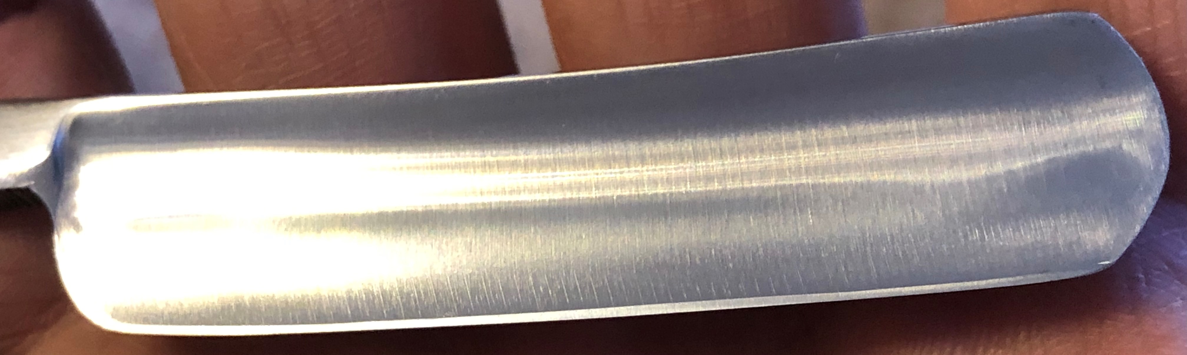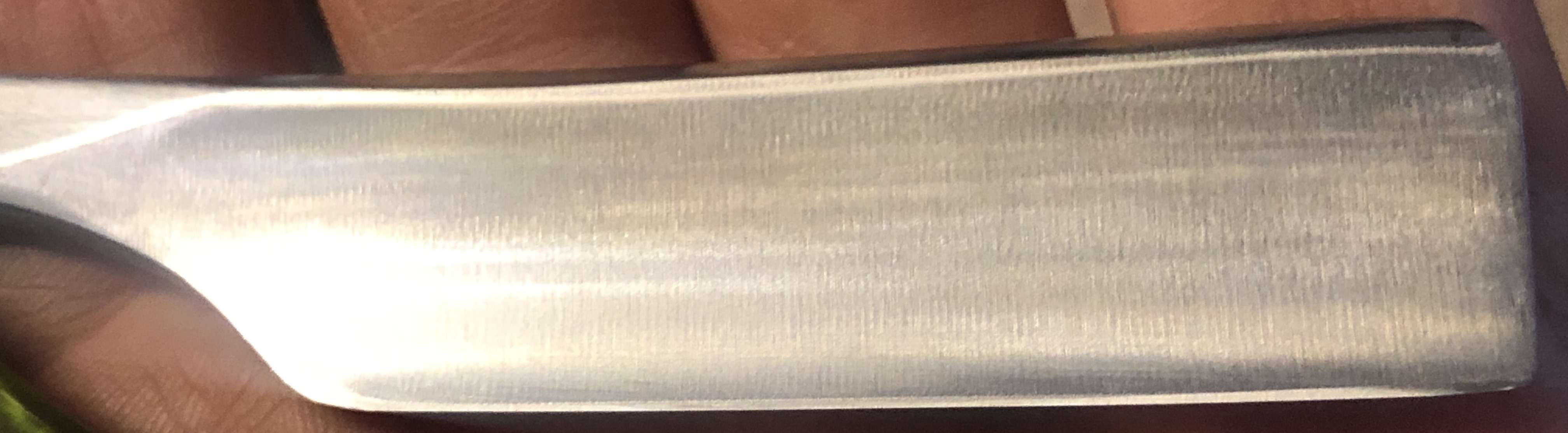 Бритва без следов пользования.Решил вдохнуть в клинок немного души и ручного творчества.Поперечную заводскую шлифовку переделал в ручной продольный сатин.Лицевая сторона полотна отшлифована до 10000 грит и отполирована, а обратная сторона клинка отшлифована до 400 грит. Грубый гринд примерно как на японских фреймах. Предварительно бритва была разобрана, почищен район осевого пина и снова собрана, с сохранением оригинальных пинов.Сталь чистая от разного рода видимых дефектов. Идеальная геометрия.Кромочка равномерна по всей длине и еле заметна.В общем и целом очень красивая эффектная бритва.Заточена и готова к бритью.