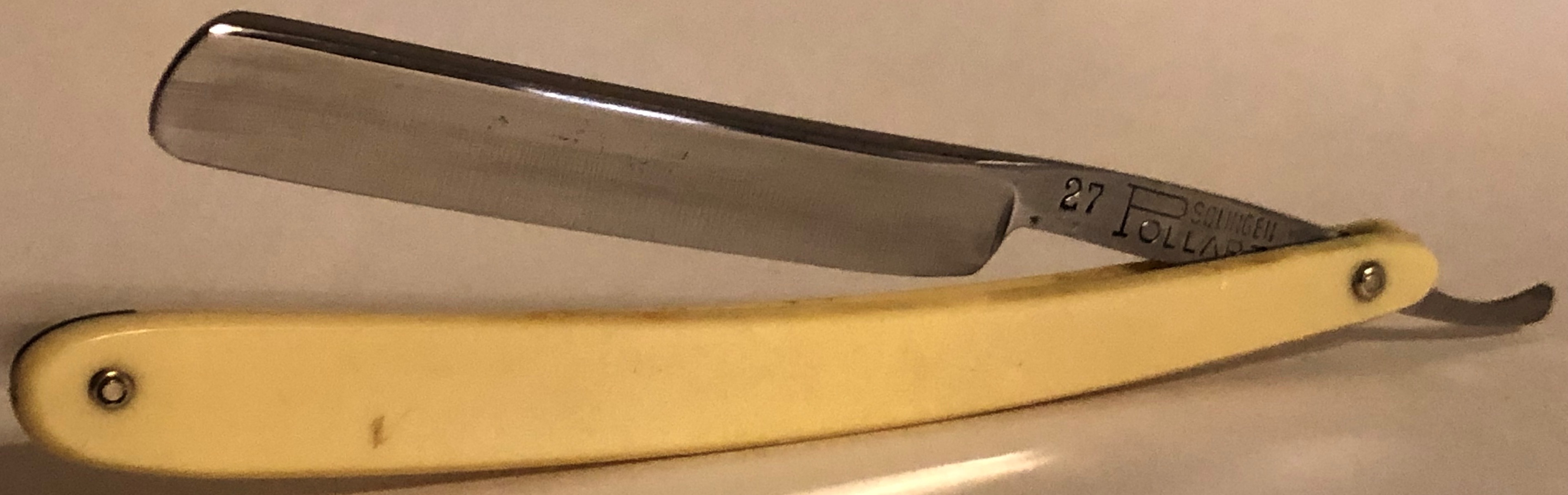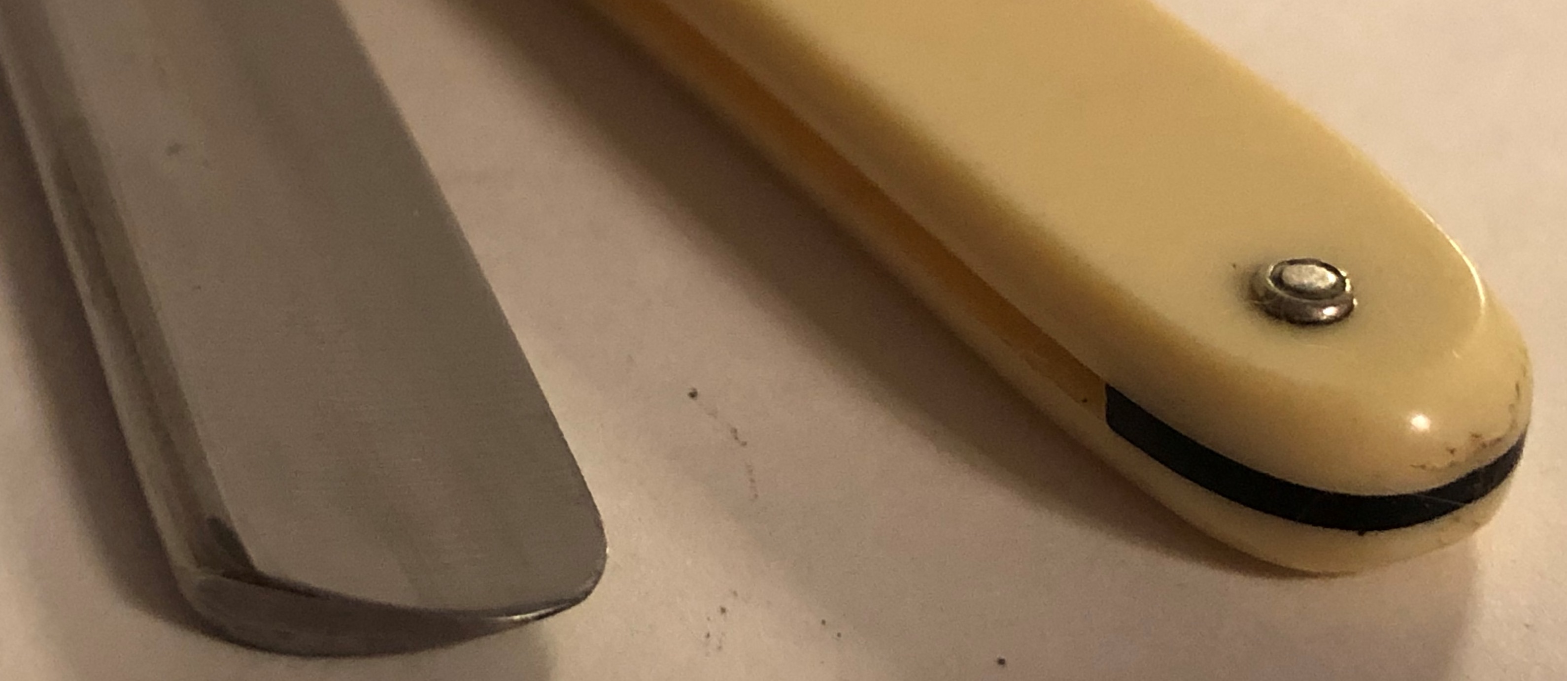 Бритва в очень хорошем состоянии. Бритва разбиралась, было освежено полотно и снова собиралась, с сохранением оригинальных пинов.Сталь и кромка чистые.Идеальная геометрия клинка:кромочка равномерна по всей длине.Тяжёлая бритва , с прекрасной сталью, способной выдать мягкое и комфортное бритьё.Заточена и готова к бритью.