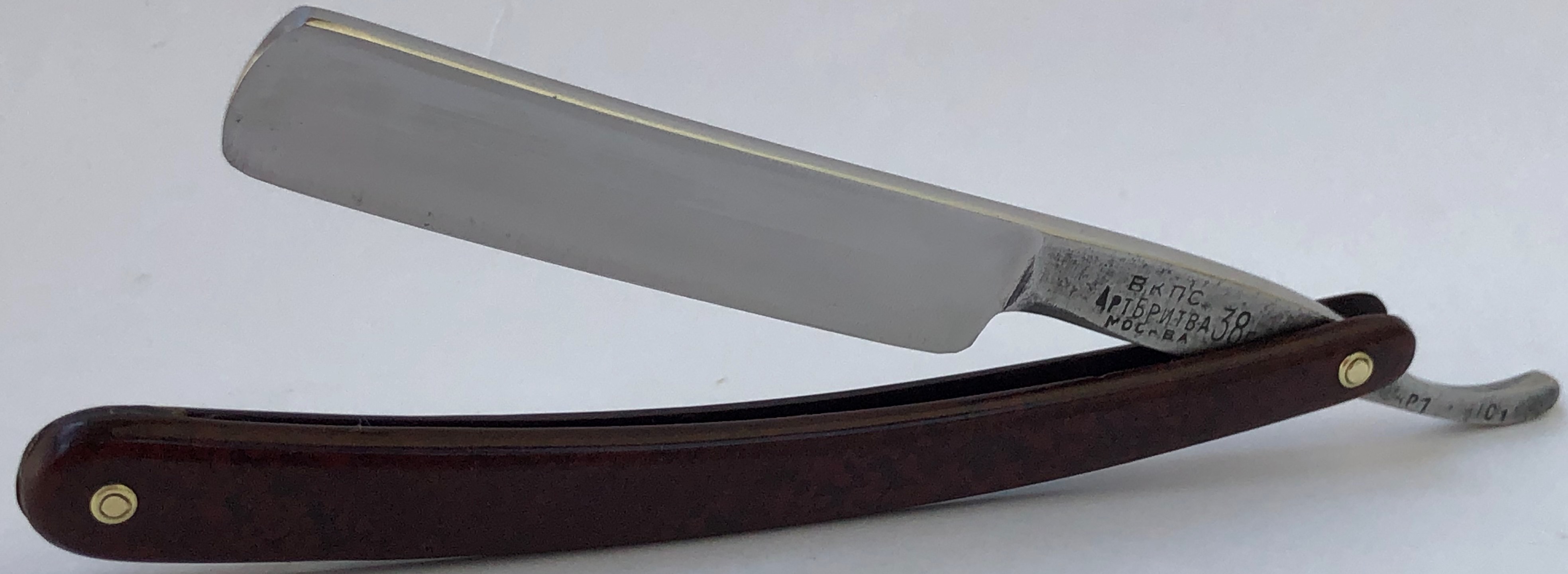 Клинок в непользованном состоянии.Бритва была разобрана и немного освежено полотно от патины и окисления в районе осевого пина. Сам пин был сохранен и заново установлен.Попытался восстановить "родной" гринд полотна и умеренно отполировал.Идеальная геометрия клинка.Кромочка аккуратная и равномерна по всей длине. Сама сталь по качеству идентична сталям от бритв 40-60-х годов. Те кто в теме, тот понимает разницу между бритвами ранних выпусков и бритвами 70-х годов.На вид бритва как новая. Будет заточена и подготовлена к бритью.Очень неплохой и бюджетный вариант для новичка.