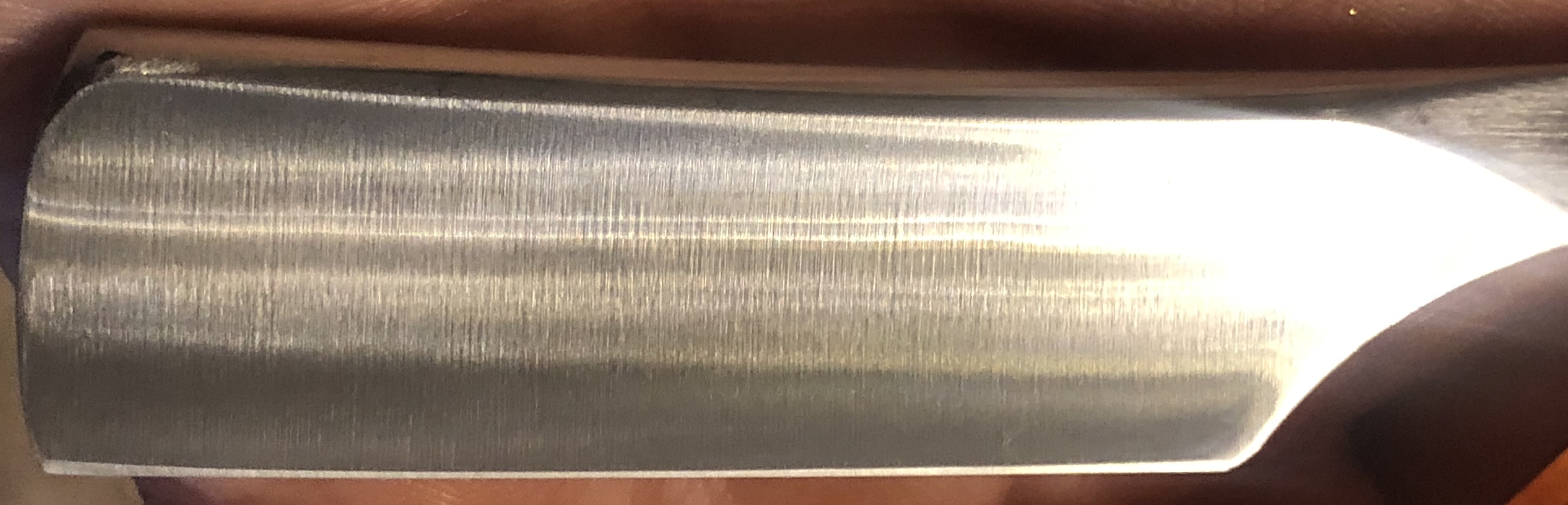 Клинок в непользованном состоянии.Бритва была разобрана и немного освежено полотно от патины и окисления в районе осевого пина. Сам пин был сохранен и заново установлен.Попытался восстановить "родной" гринд полотна и умеренно отполировал.Идеальная геометрия клинка.Кромочка аккуратная и равномерна по всей длине. Сама сталь по качеству идентична сталям от бритв 40-60-х годов. Те кто в теме, тот понимает разницу между бритвами ранних выпусков и бритвами 70-х годов.На вид бритва как новая. Будет заточена и подготовлена к бритью.Очень неплохой и бюджетный вариант для новичка.