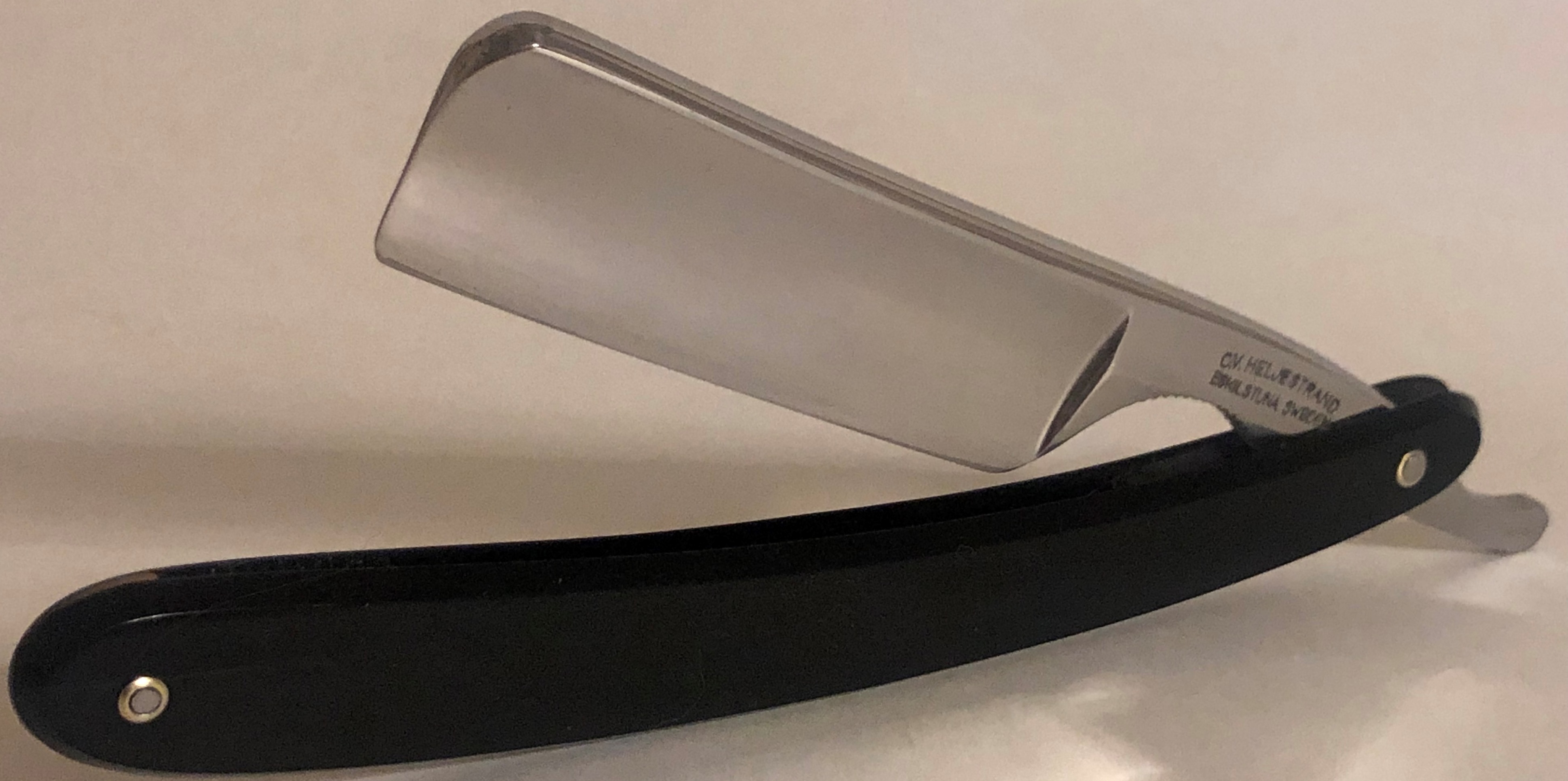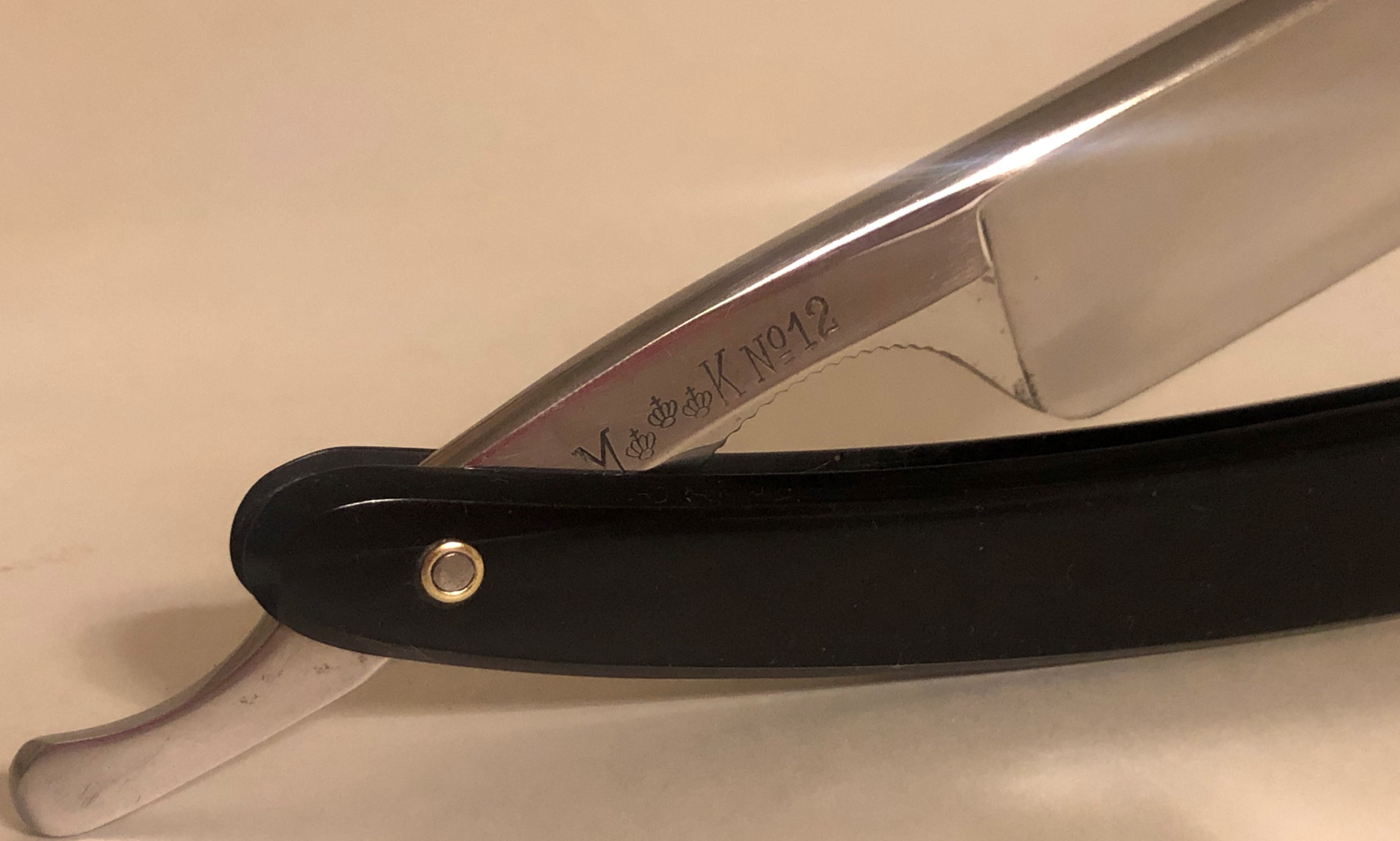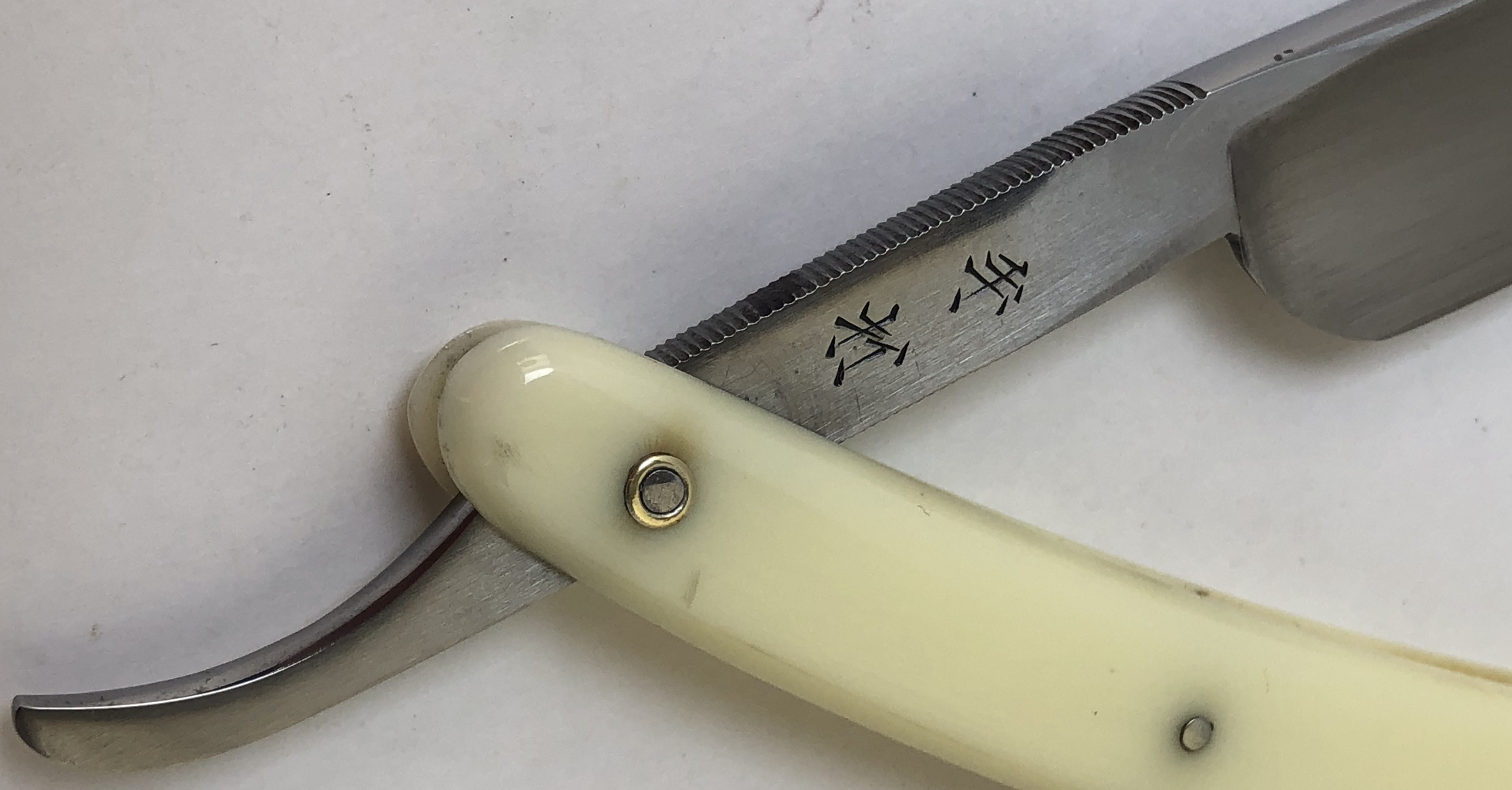 Клинок находится в идеальном состоянии.Оригинальная шлифовка и полировка.Родную оправу проклеил намертво и поменял пины на двух-цветные втулки.Идеальная геометрия клинка.Кромочка равномерна по всей длине и еле заметна.Перед отправкой будет заточена и доведена до комфортного бритья.