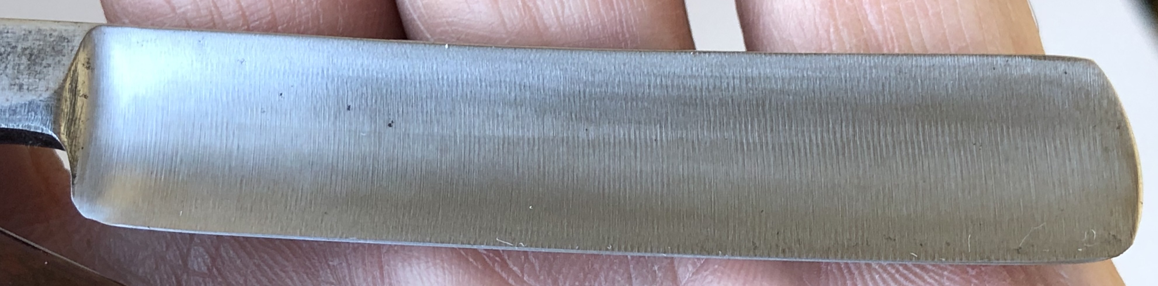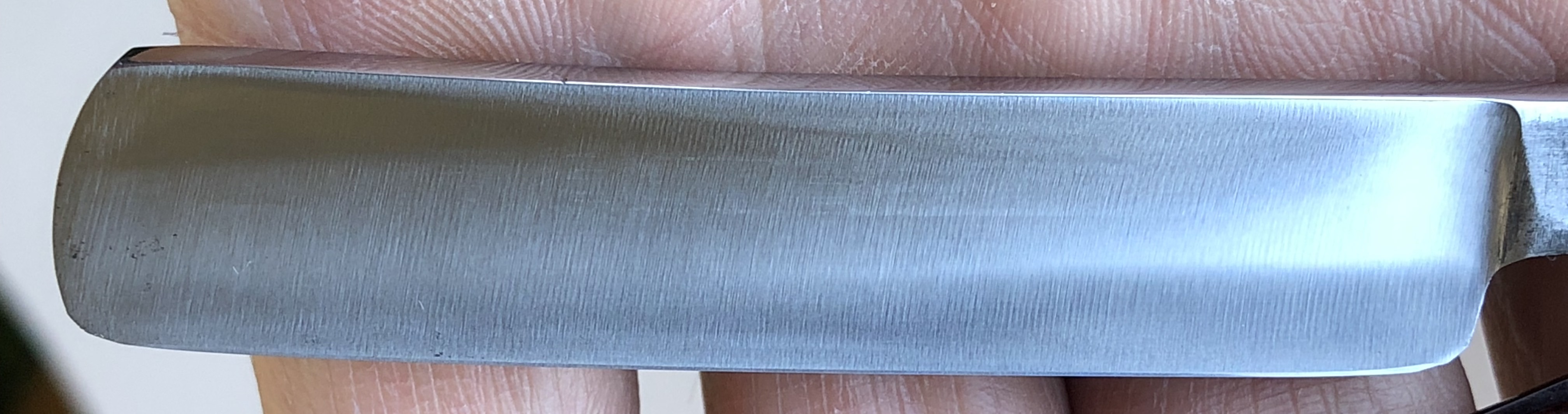 Бритва без следов пользования.Решил вдохнуть в клинок немного души и ручного творчества.Поперечную заводскую шлифовку переделал в ручной продольный сатин.Лицевая сторона полотна отшлифована до 10000 грит и отполирована, а обратная сторона клинка отшлифована до 400 грит. Грубый гринд примерно как на японских фреймах. Предварительно бритва была разобрана, почищен район осевого пина и снова собрана, с сохранением оригинальных пинов.Сталь чистая от разного рода видимых дефектов. Идеальная геометрия.Кромочка равномерна по всей длине и еле заметна.В общем и целом очень красивая эффектная бритва.Заточена и готова к бритью.