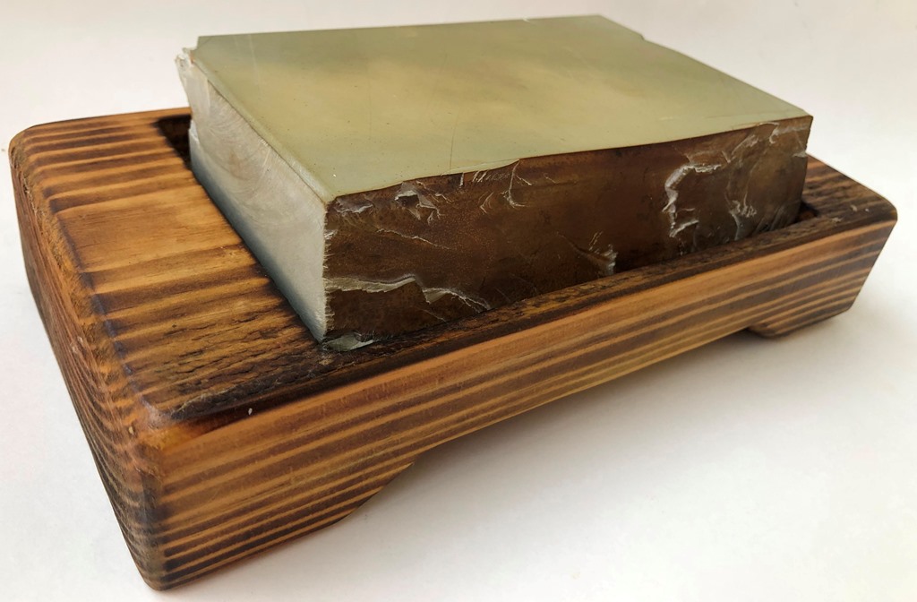 Камень непользованный.Подойдёт для финишной доводки опасных бритв, а также супер-финиша ножей и столярки.Практически не выдаёт собственной суспензии. Поверхность от работы начинает выглаживаться, зеркалить и работать тоньше.Тяжёлый, мощный камень, на все случаи жизни. Надолго хватит.В комплекте с камнем идет некая нагурка.Примерно уровня ботана или мержиро(тензе).Нагурка отдается с камнем .Шикарная подставка из обожжённой лиственницы и пропитанной датским маслом.Специально камень не вклеивал в короб, чтобы дать возможность будущему владельцу самостоятельно решить, как удобно будет работать в будущем.