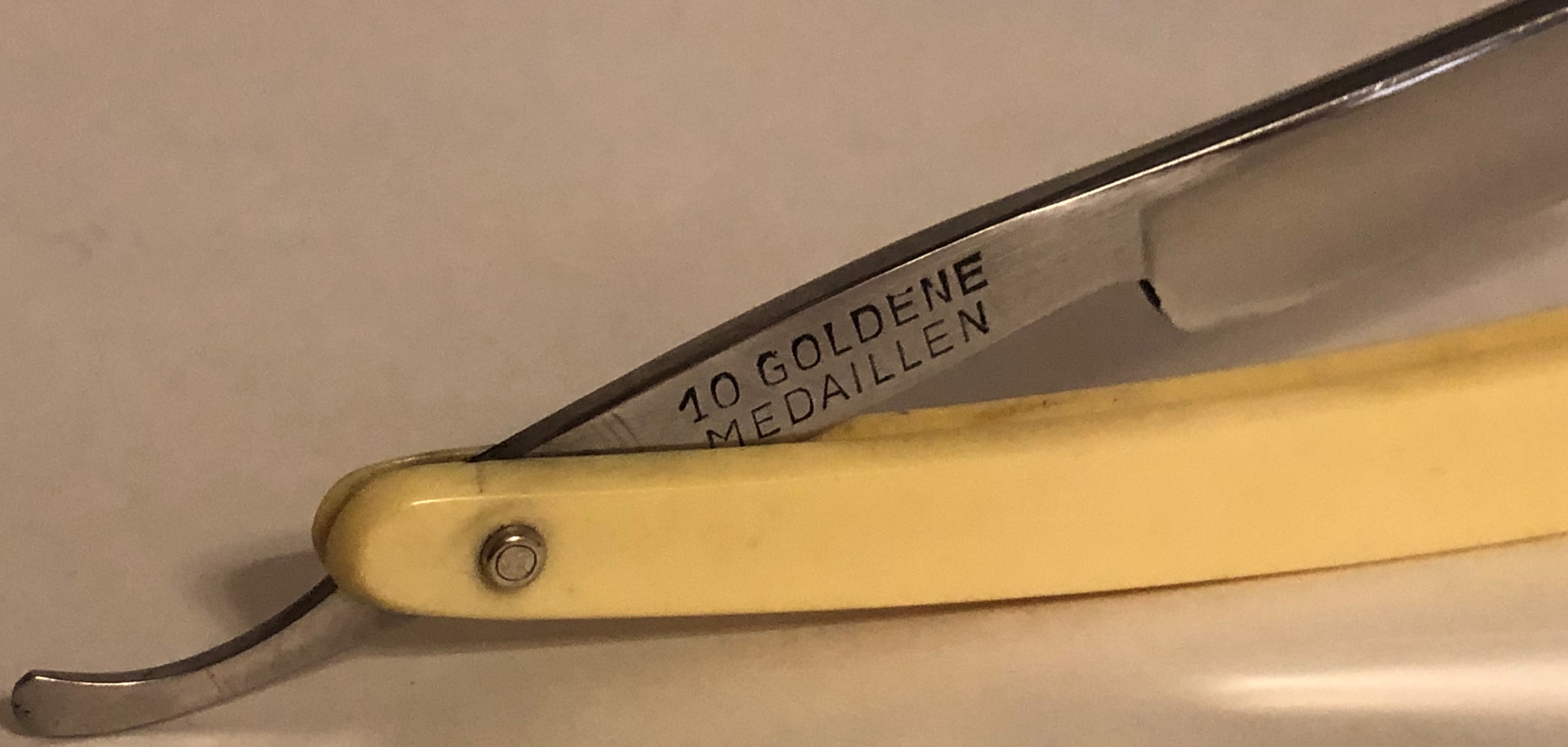 Бритва в прекрасном состоянии для своих лет,без следов пользования.Была разобрана, очищен район осевого пина от многолетней патины и окисления, немного освежено полотно и снова собрана, с сохранением оригинальных пинов.Сталь чистая от разного рода видимых дефектов.Идеальная геометрия клинка:кромочка равномерна по всей длине.Заточена и готова к бритью.Не пропустите неординарную и красивую бритву для своей коллекции!